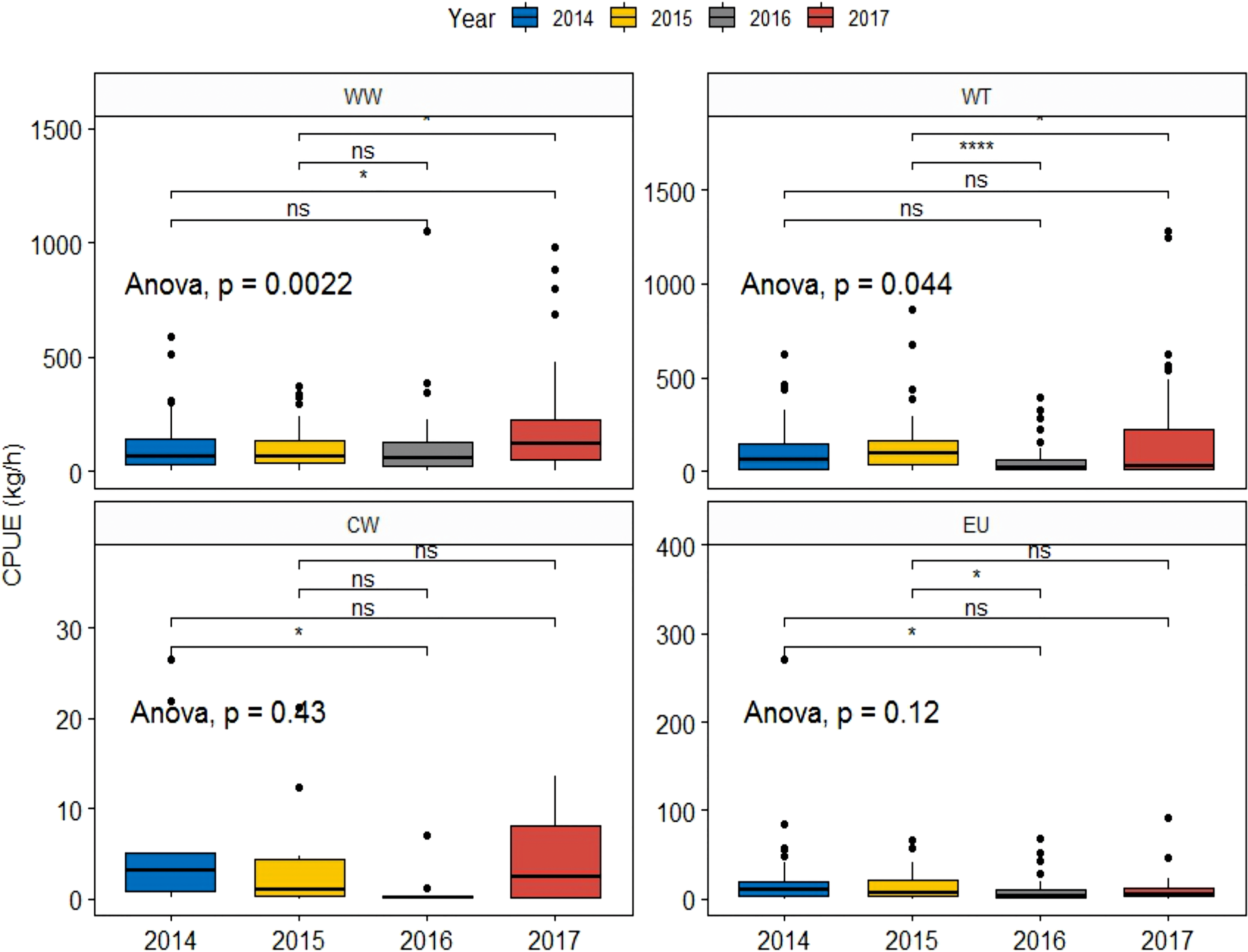 CPUE of WW, WT, CT, and EU species in the years before (2014–2015) and during (2016–2017) the MHW events. All pairs of groups were compared using the Kruskal–Wallis test for one-way ANOVA. * indicates significance at p<=0.05; **** indicates significance at p<=0.0001; ns indicates no statistical significance.
