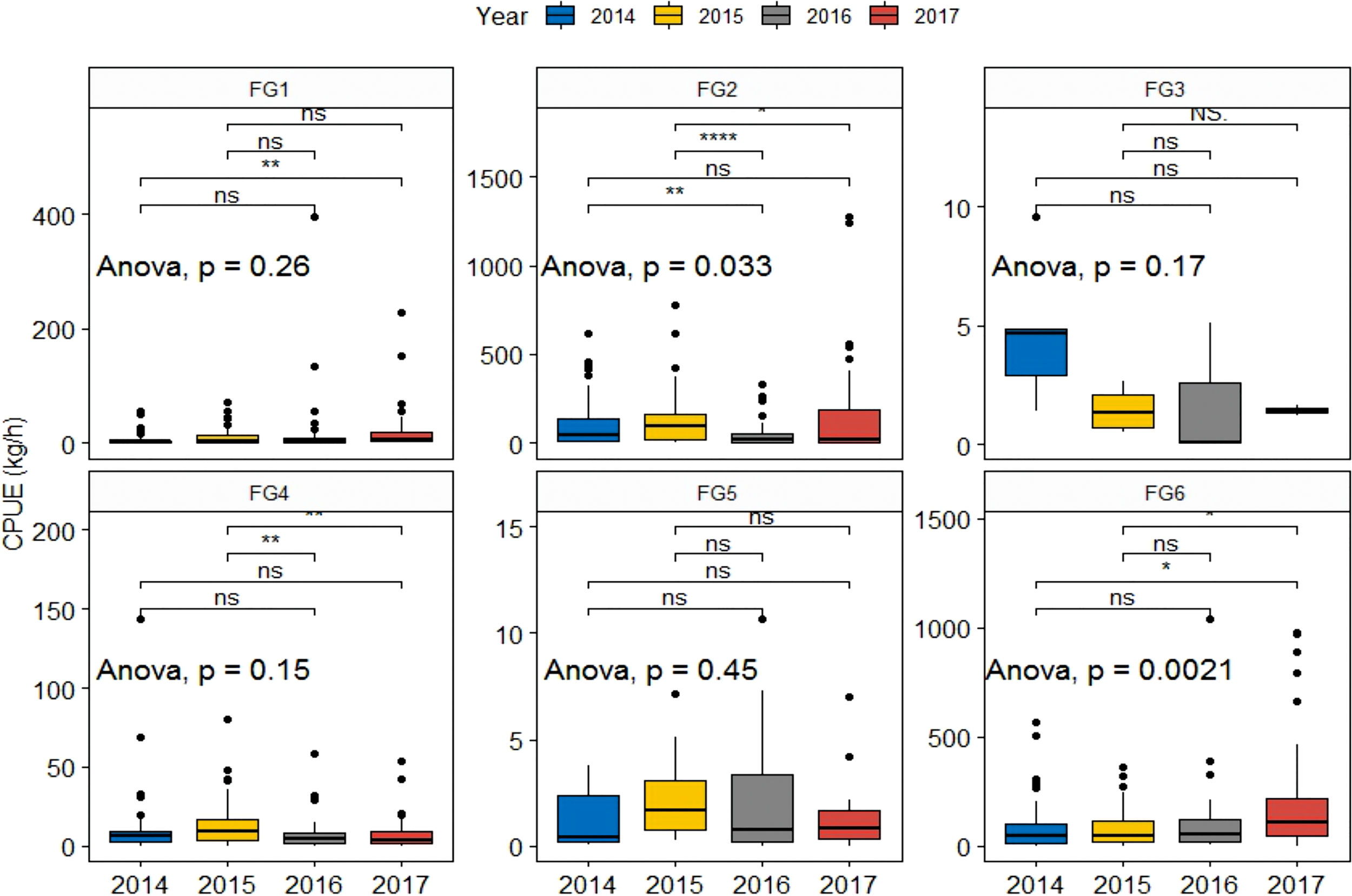 CPUE feeding functional groups for fish in the years before (2014–2014) and during (2016–2017) the MHWs. All pairs of groups were compared using the Kruskal–Wallis test for one-way ANOVA. * indicates significance at p<=0.05; ** indicates significance at p<=0.01; **** indicates significance at p<=0.0001; ns indicates no statistical significance.