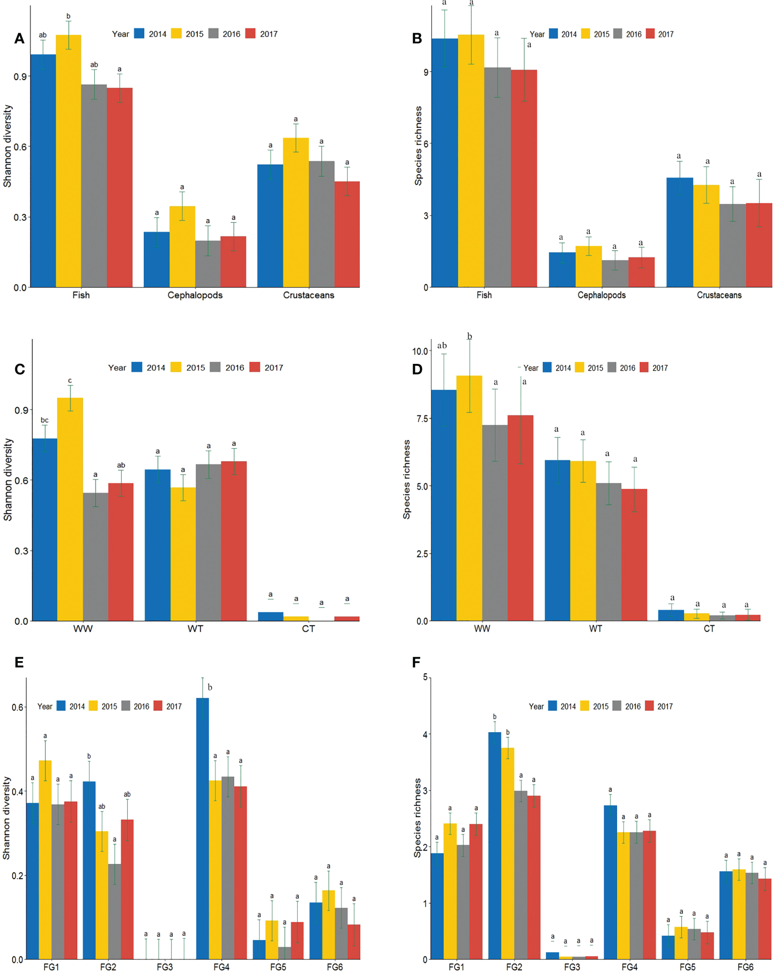 Figure 5 shows the species composition among the taxonomic classification, thermal preference, and functional groups. In total, 194 species were collected from the 45 sampling sites; the number of species in 2014–2017 was 110, 117, 102, and 119, respectively. The most species-rich taxonomic group was fish, followed by shrimps, cephalopods, and crabs. Of these, most fish, shrimps, cephalopods, and crabs belong to WW species in terms of their thermal preference, followed by WT species. According to the classification of feeding functional groups, FG1 and FG2 were dominated by WW species, while the proportion of WT species in FG3, FG4, and FG5 showed a small increase trend compared with FG1 and FG2.