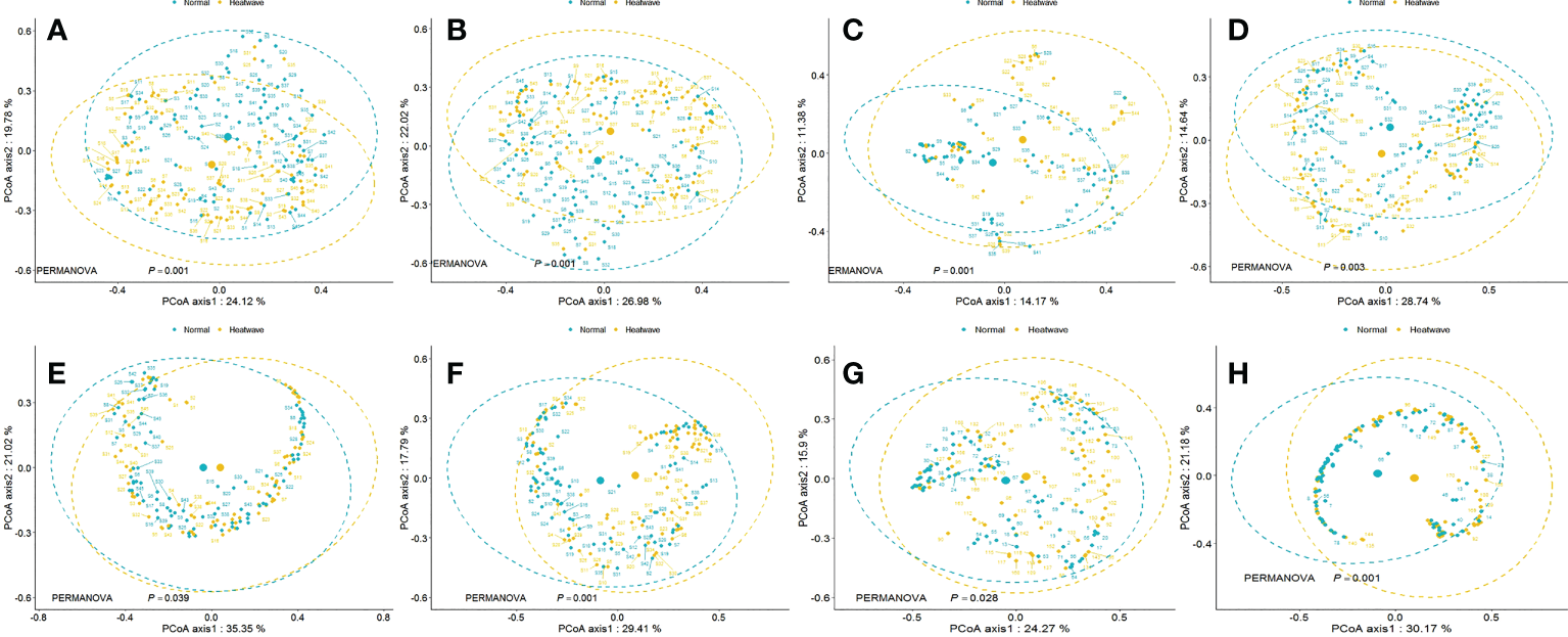 Beta diversity was calculated by temporal dissimilarity, which revealed different variations among samples within or between NY and MHW years. The median values of overall temporal dissimilarity within NY (2014 to 2015) and MHW years (2016 to 2017) were 0.478 and 0.476, respectively. These values showed little change, but in the regime shift from NY to MHW years (2015 to 2016), the overall dissimilarity increased to 0.519. Moreover, the median value of the overall temporal beta-diversity was larger for any combination of communities between NY and MHW years than that of communities within NY or MHW years (Figure 10).