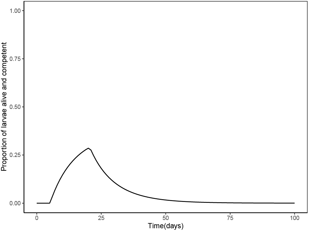 The survival data was best fit with a Weibull model, such that the mortality rate was initially high, but decreased over time (Appendix, Equation 2). Larvae began acquiring competency at day 5 (tc=5.12 days) and acquired competency at a constant rate (a = 0.063 day-1). Loss of competency was modelled equally well by the exponential and Weibull models. Therefore, we used the Weibull model (Appendix, Equation 8) because it had was the best choice to model loss of competency for Acropora millepora that used a longer data collection period (Figueiredo et al., 2022). Thus, the per capita rate of loss of competency was not constant over time (η=60.36698), with the rate of loss being initially high, and decreasing over time. As a result, the proportion of larvae that are alive and competent is null the first 5 days (tc=5.12 days), and then it increases, peaking around day 20, and then rapidly decreasing over time until around day 40, when it then slowly decreases (Figure 2).