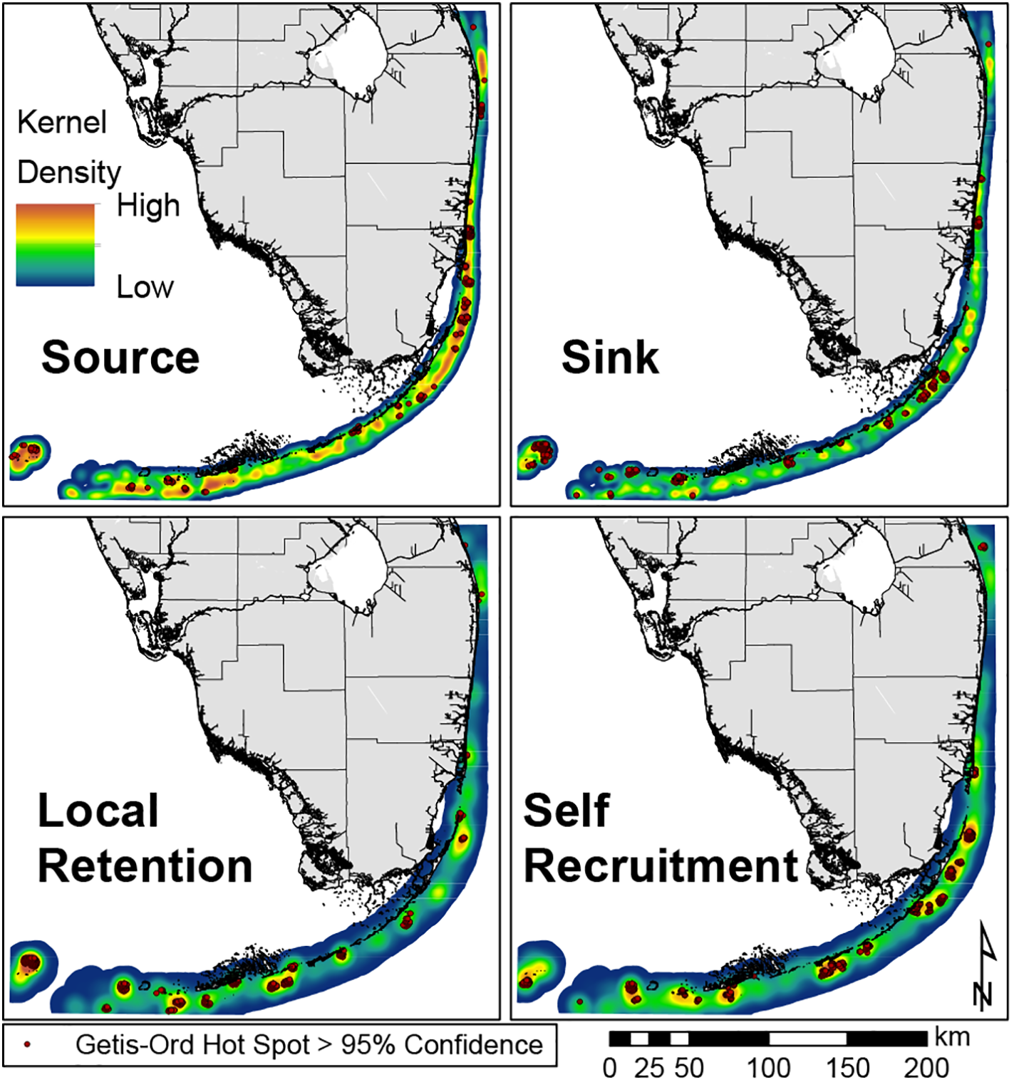 Getis-Ord Hot Spot analysis with >95% confidence overlying a Kernel Density interpolation for each connectivity metric (Source, Sink, Local Retention, and Self Recruitment). Warmer colors denote higher metric values, while cooler colors denote lower metric values. Hot Spots for each metric (dots) are well distributed throughout the reef system, indicating a well-connected system. Source clusters indicate better reefs for outplanting, as they will be good for replenishing downstream sites, whereas sink clusters indicate better reefs for measures to improve settlement probability. Sink clusters reefs could indicate better reefs to obtain nursery genotypes from, as these sites should have higher genetic diversity from their connections from other sites. High self-recruitment clusters indicate better reefs for greater conservation efforts due to stronger isolation. These may be good sources for genotypes with certain local adaptations. Local retention clusters indicate reefs better at replenishing themselves, so these may have reduced natural recovery after a disturbance.