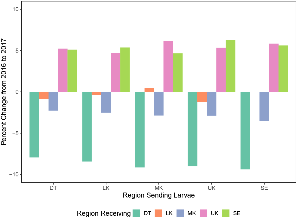 The percent change in the proportion of larvae exchanged between each region from 2016 to 2017. Each region of Florida’s Coral Reef is denoted by a different color: Dry Tortugas (DT) teal; Lower Keys (LK) in orange; Middle Keys (MK) blue; Upper Keys (UK) pink; Southeast (SE) lime green. DT, LK, and MK all received a smaller proportion of larvae in 2017, while UK and SE received a greater proportion of larvae in 2017 than in 2016.