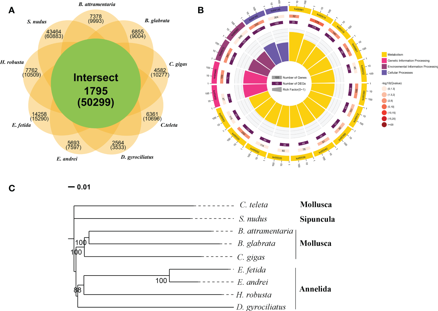Genome comparison and phylogenetic analysis. (A) Venn diagram exhibiting the core and special gene family in nine species; (B) The functional enrichment analysis of special genes in S. nudus using KEGG annotation. The outermost ring represents the top 20 of pathway enrichment. Then, from outside to inside, four rings represent the pathway ID, number of all genes in the pathway, number of special genes in the pathway and classification of pathway. (C) Phylogenetic relationships among mollusca, sipuncula and annelida base on single copy homologous genes. Batillaria attramentaria: B attramentaria; Biomphalaria glabrata: B glabrata; Capitella teleta: C teleta; Crassostrea gigas: C gigas; Dimorphilus gyrociliatus: D gyrociliatus; Eisenia fetida: Efetida; Eisenia Andrei: E Andrei; Helobdella robusta: H robusta.