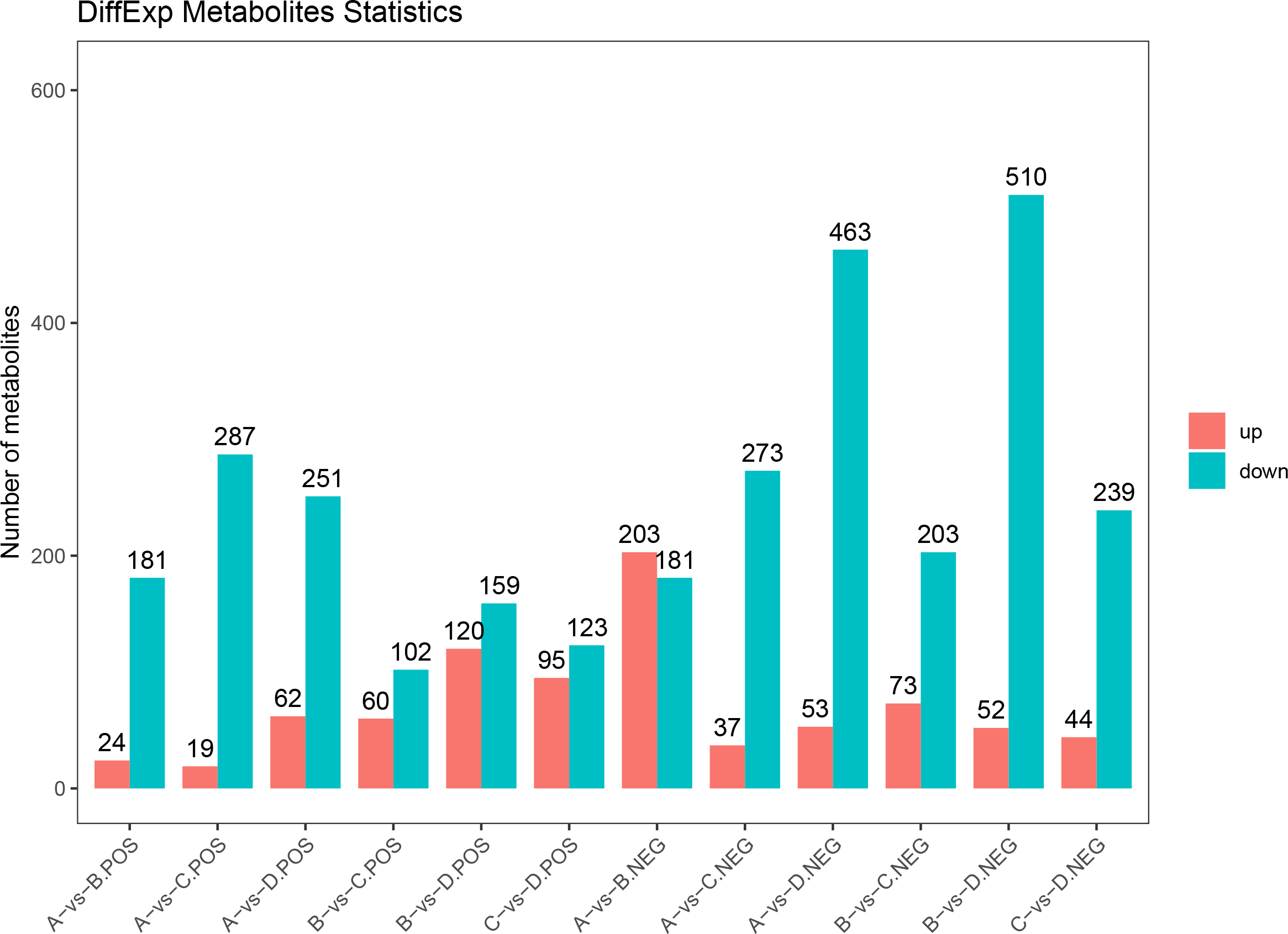 Differential metabolites between S. nudus growth stages. (A, B, C, D) represent four developmental stages of S. nudus: larve, one-quarter of adult, half of adult and adult, respectively.