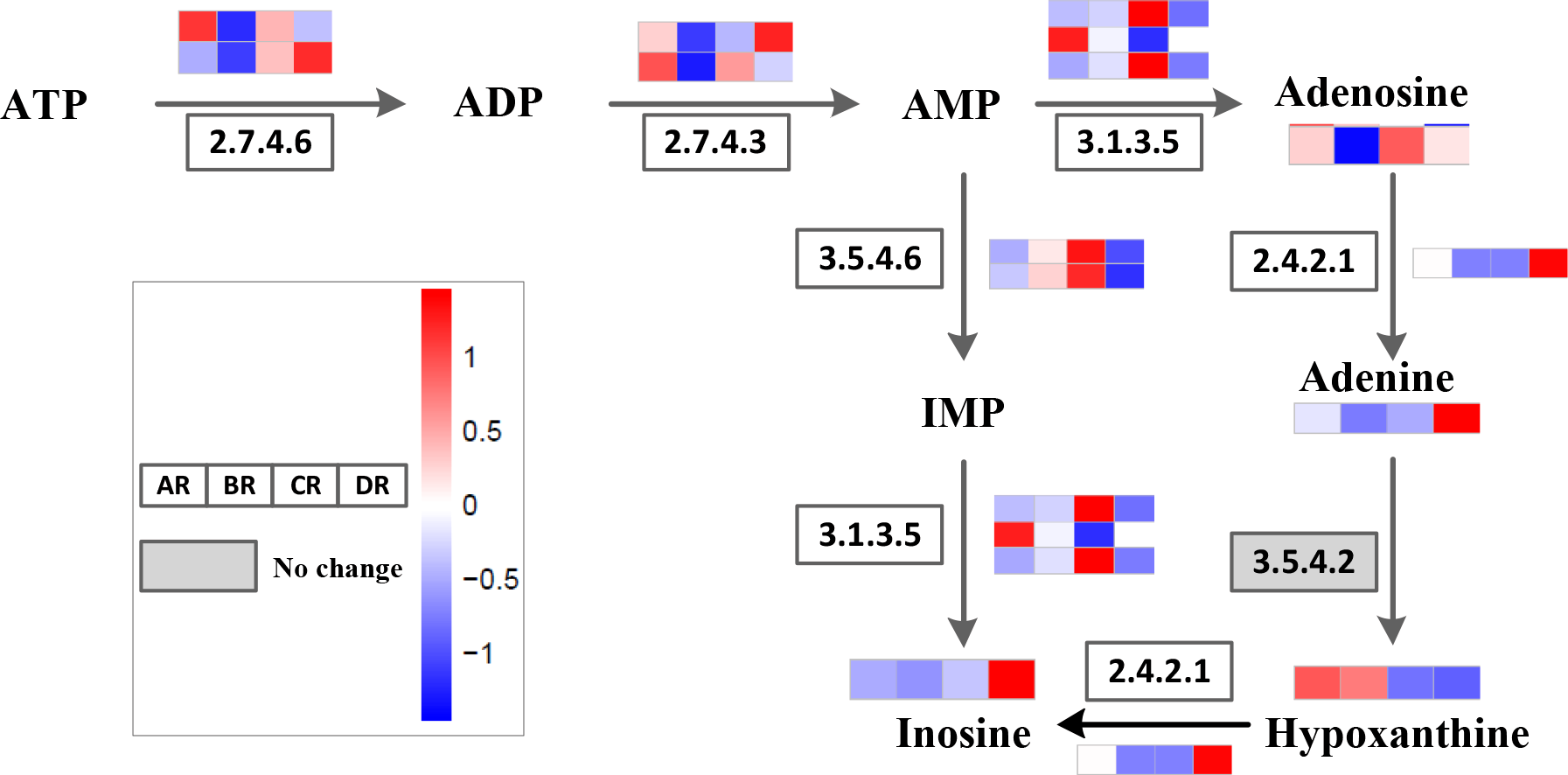 Changes of gene expression and metabolic level involved in the inosine biosynthesis.