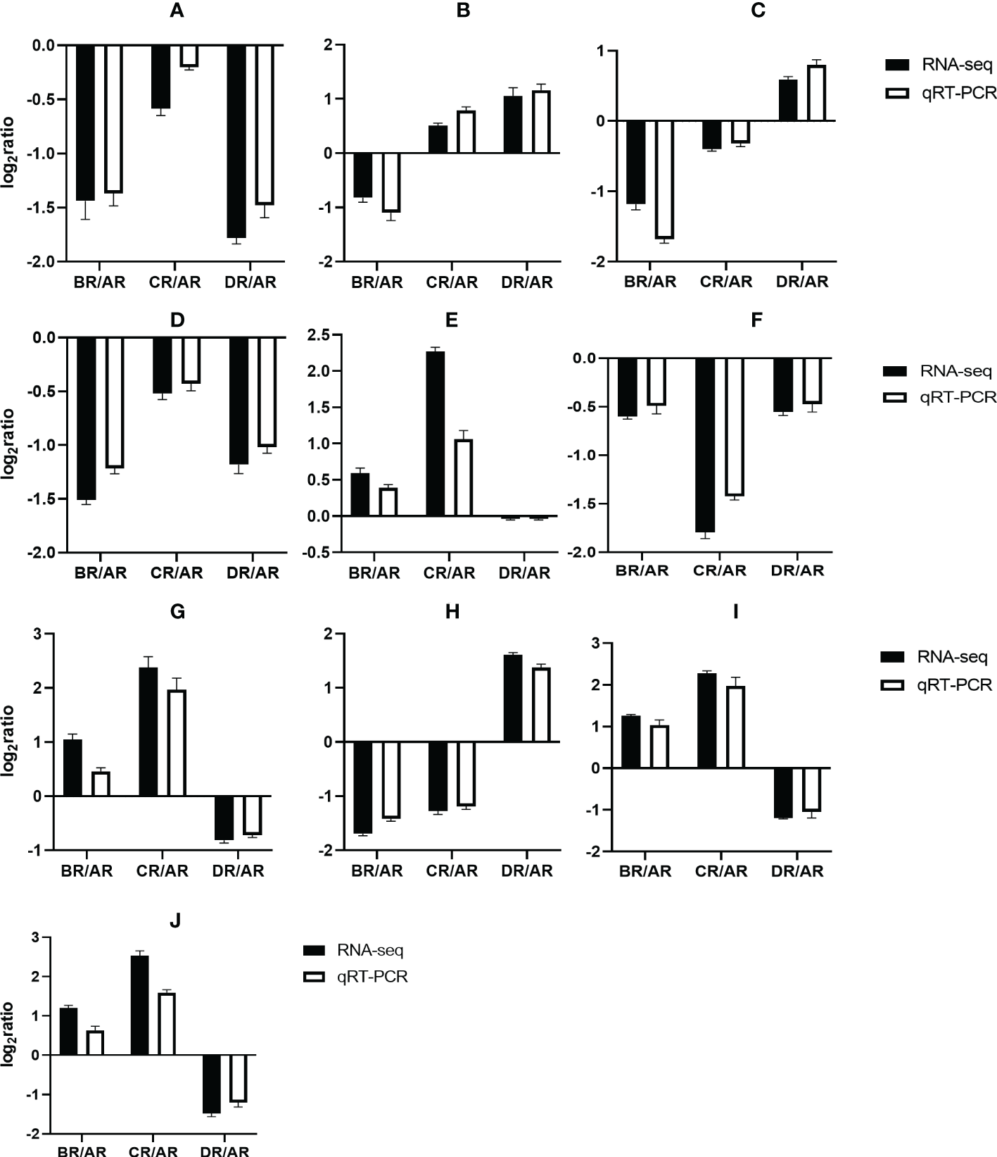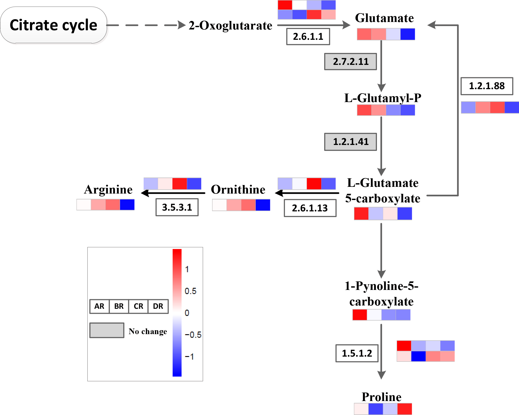 To characterize the functional differences between various growth stages of S. nudus, DEGs were analyzed by GO and KEGG enrichment analyses to explore the relevant biological functions. GO functional enrichment analysis revealed that the most gene number was enriched in groups of AR-VS-DR and BR-VS-DR, which was consistent with DEGs analysis (Figure S3). These significantly regulated genes were mainly related to cellular process, single-organism process, metabolic process and catalytic activity. To further investigate the function of these DEGs, we mapped the identified DEGs to specific biochemical pathways. The results showed that the most gene number was enriched in groups of AR-VS-DR and BR-VS-DR, which was in agreement with GO functional enrichment. The results suggested that specific regulators were required for the transition from a larve to an adult. KEGG pathway analysis showed that these DEGs were mainly enriched in the pathways of amino acid metabolism, lipid metabolism and transport and catabolism (Figure 4).