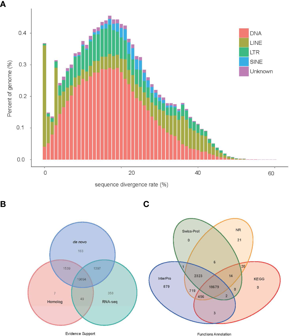 Genome annotation information (A) TE divergence distribution, the x-axis is the degree of divergence between the annotated TE sequence in the genome and the corresponding sequence in Repbase. The y-axis is the percentage of TE sequence in the genome. (B) Statistics supported by evidence for protein-coding gene sets. (C) Statistical results of gene function annotation.