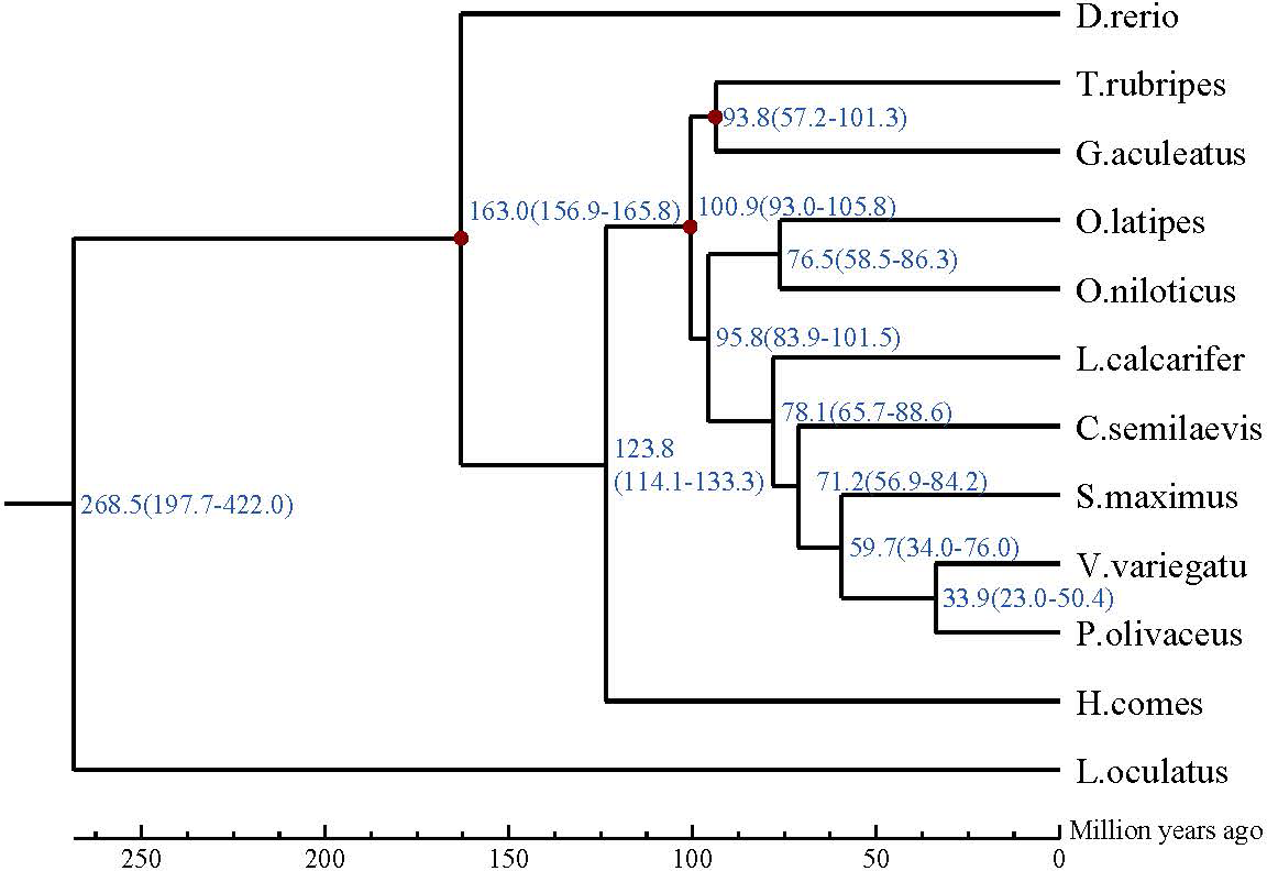 For phylogenetic analysis, we extracted single copy gene families from OrthoFinder results. For each single-copy gene family, we used mafft v7.429 (Katoh and Standley, 2016) for multiple sequence alignment, and GUIDANCE V2.02 (Sela et al., 2015) used multiple sequence alignment information to construct supperMSA. Then we used IQ-TREE v2.0-rc1 (Minh et al., 2020) to build the evolution tree. Finally, we used MCMCTree from the PAML v4.9j (Yang, 2007) to estimate the divergence time between 12 lineages, three calibration points (Benton and Donoghue, 2007) based on fossil records were used to calibrate the substitution rate, including Gasterosteus aculeatus (97.8-150.9Mya), Oryzias latipes (97.8-150.9Mya), Danio rerio (149.85-165.2Mya).