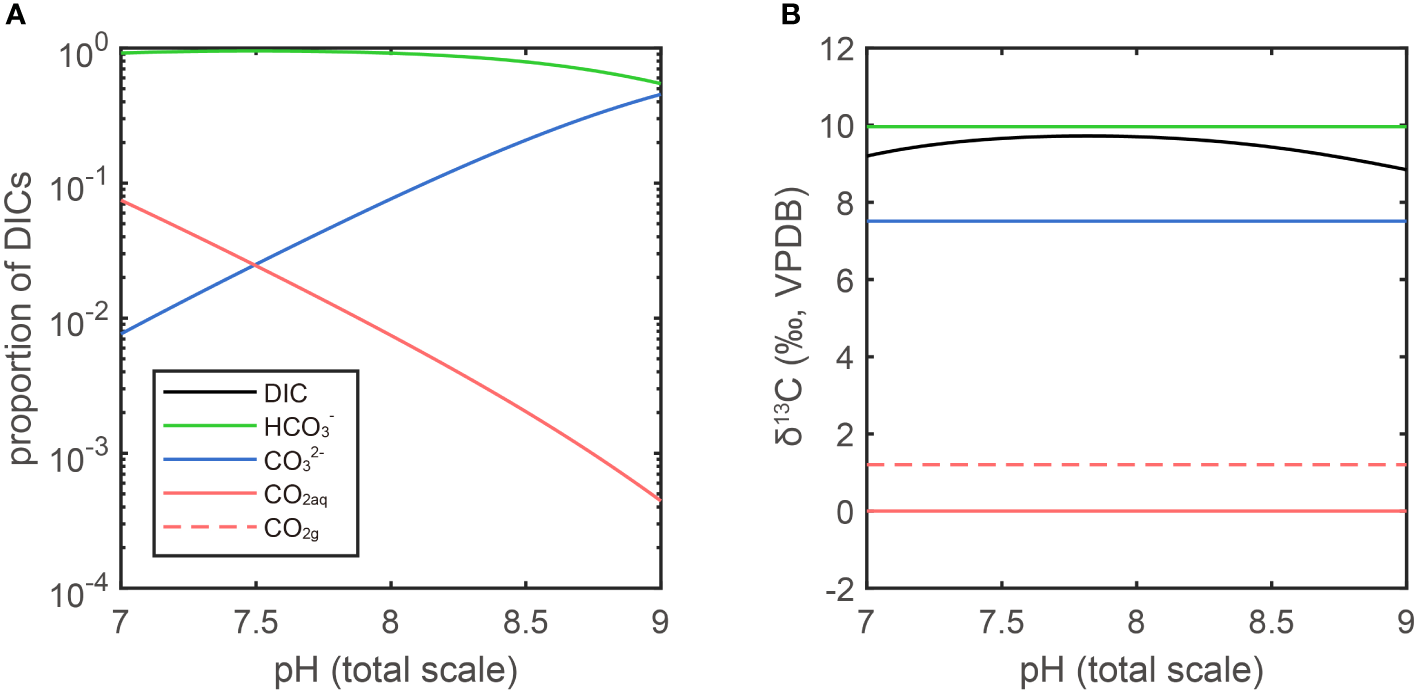 DIC proportion and isotope fractionation in different pH. (A) The ratio of the three components of DIC are plotted on a log scale in function of pH for a seawater at T = 291.15K and Salinity = 35‰. (B) The isotopic fractionations are calculated by the parameters in Table A1. The δ13CVPDB of CO2(aq) is arbitrarily set as 0‰ (red line). In isotopic equilibrium, the CO2(g) is heavier than CO2(aq) by 1.2‰, the HCO3- is heavier than CO2(aq) by 9.8‰ and CO32- is heavier than CO2(aq) by 7.4‰ (Zhang et al., 1995). The fractionation between total DIC and CO2(aq) is a function of pH as it determines the proportion of each DIC.