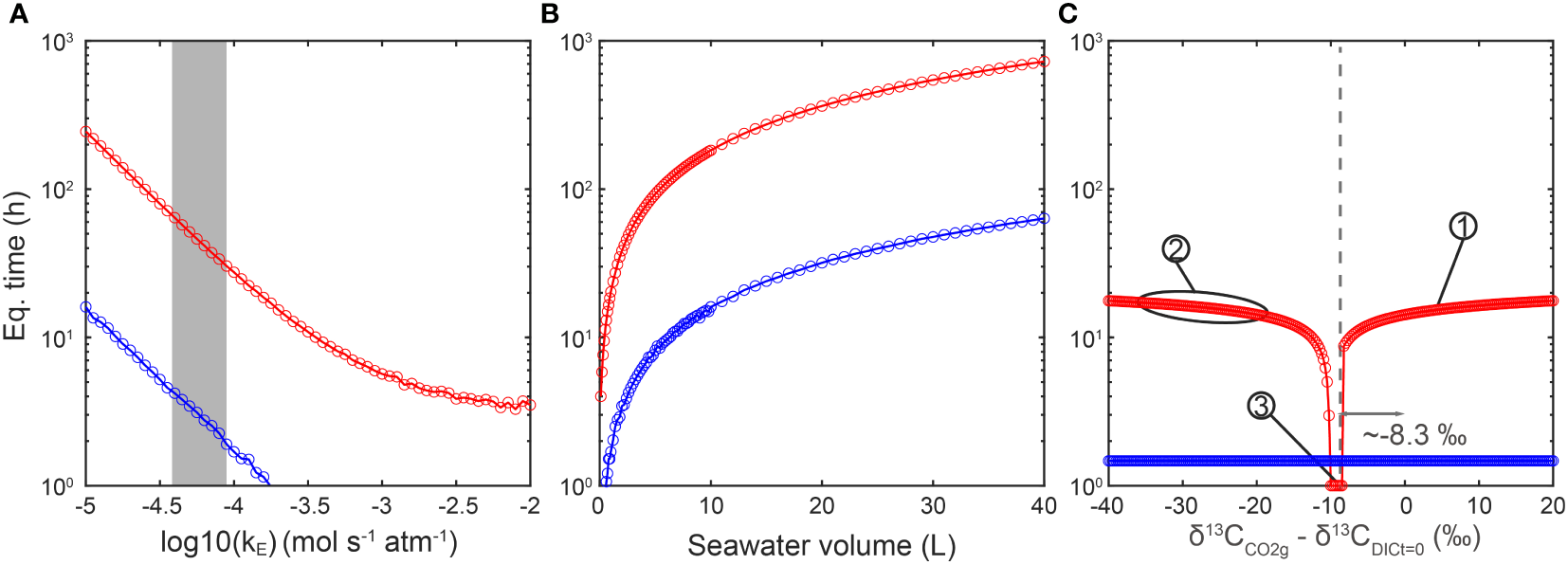 For the CO2 bubbling method, the guidebook by Riebesell et al. (2011), covering the methods of laboratory culture for ocean acidification research, highlighted the importance of pre-equilibrating the culture media to the required CO2 concentration by aerating it ‘for a few days’. Considering the wide range of culture vessel shapes and volumes among experiments, our question is how long culture media should be bubbled in order to reach an ordinary chemical and isotopic balance. Some published works mentioned the pre-bubbling durations, for example, the seawater was pre-bubbled for 2 days (Iglesias-Rodriguez et al., 2008), while most publications did not fully describe their methods. Moreover, the isotopic equilibration times are usually much longer than the ordinary chemical equilibration times, because, to reach isotopic equilibrium, each ion and molecule should be fully exchanged and come to equilibrium with other ions and molecules (Mills and Urey, 1940). For the works focusing on organic or carbonate carbon isotope fractionations under different CO2 levels, culture media with out of equilibrium or dynamic carbon isotope ratio of DIC could complicate or even preclude the interpretation of stable isotope fractionation signatures.