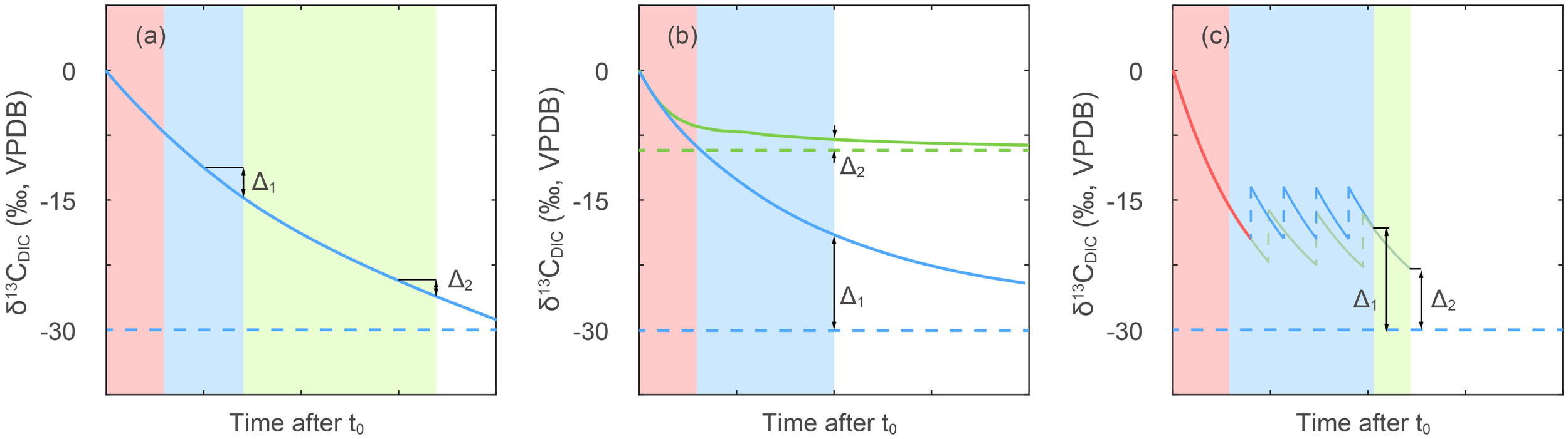 The δ13CDIC before bubbling are around -6.1‰ (-6.54~-5.65‰). With the onset of bubbling, δ13CDIC responded logarithmically, increasing fastest during the first hours and slowing the rate of increase in the following days. The δ13CDIC in both experiments did not increase further after reaching values around 5.5 ‰, about 8.3 ‰ higher than the CO2(g), which well fitted our prediction in the last section. The δ13CDIC reached equilibrium with CO2(g) at 6 days in low CO2 experiment with pCO2 = 470 ppm, while in the other experiment, the isotopic equilibrium was achieved at 5 days after bubbling. In our simulations, the carbon exchange rate between CO2(aq) and HCO3- is more than two orders of magnitude higher than the rate between CO2(g) and CO2(aq). Therefore, carbon isotope ratios of CO2(aq) (δ13CCO2(aq)) are almost parallel with δ13CDIC (dashed lines in Figure 3).