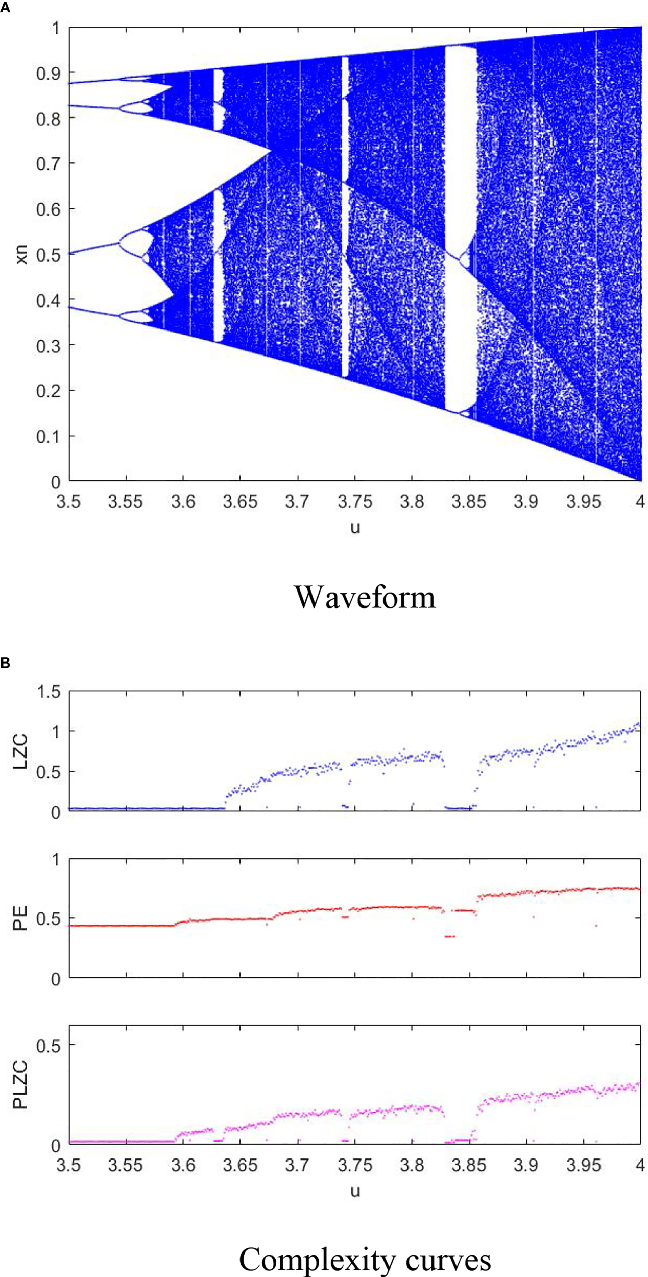 Waveform and complexity curves of logistic model: (A) Waveform; (B) Complexity curves.