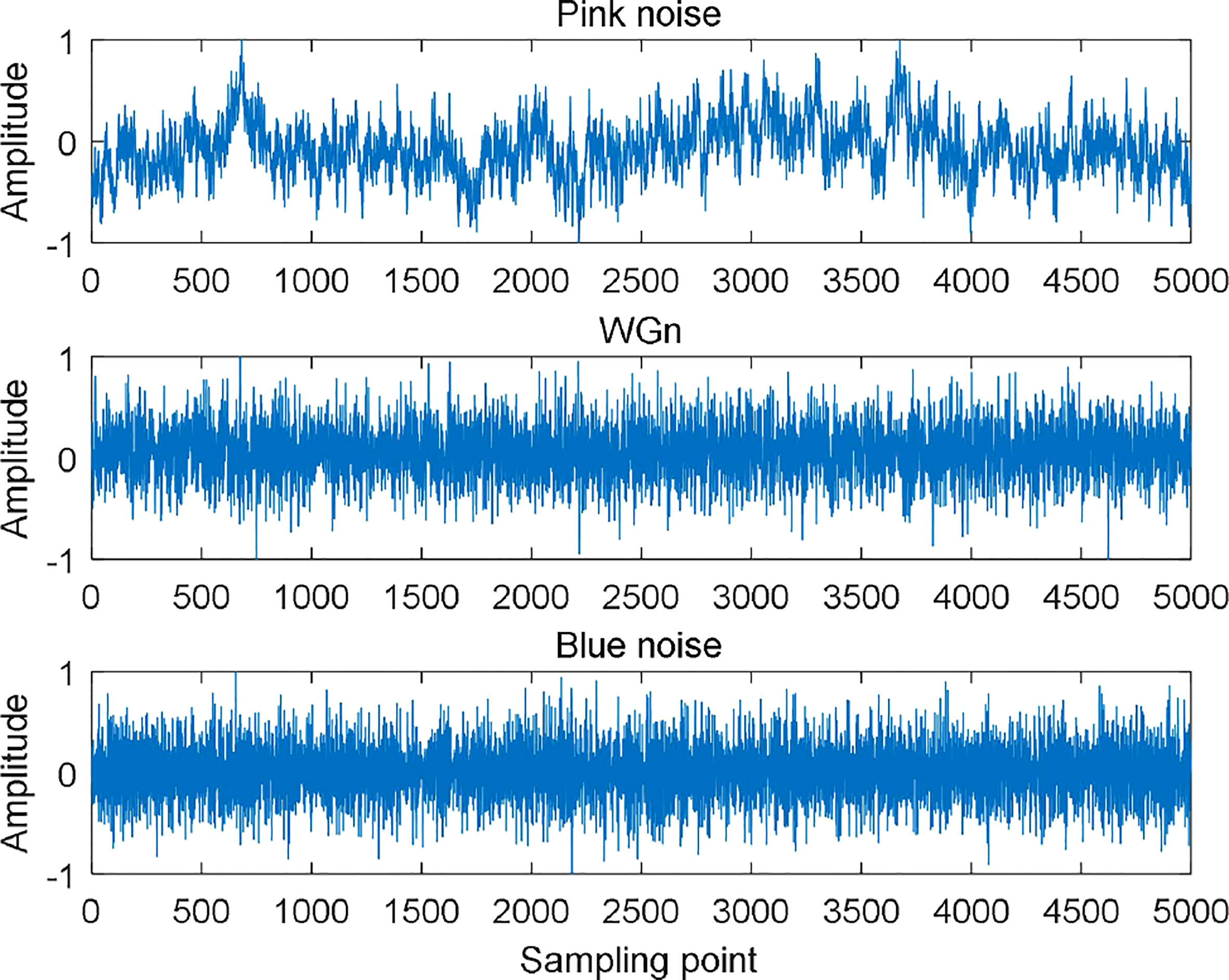 To confirm the ability of MPLZC to discriminate different noise signals, a comparison experiment was conducted for pink noise, white Gaussian noise (WGn) and blue noise. Figure 4 shows the normalized results of three types for noise signal.