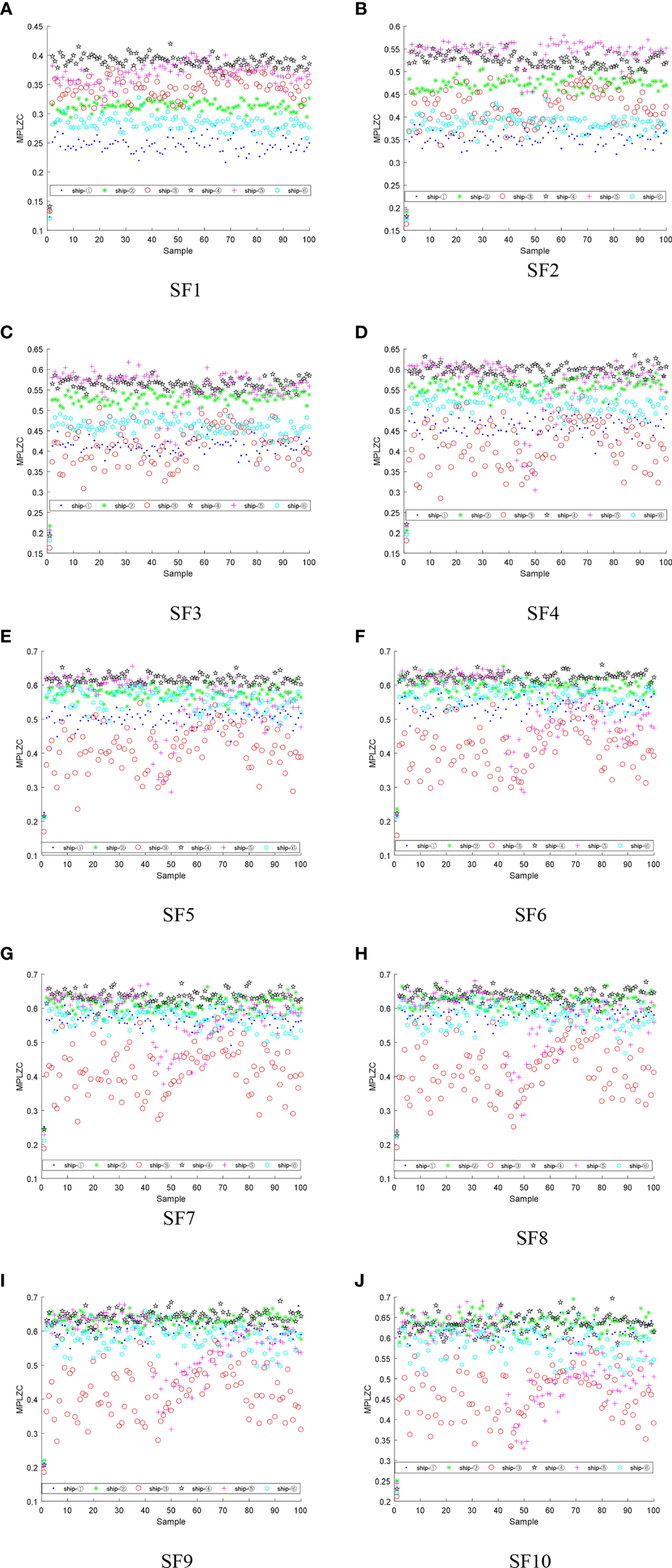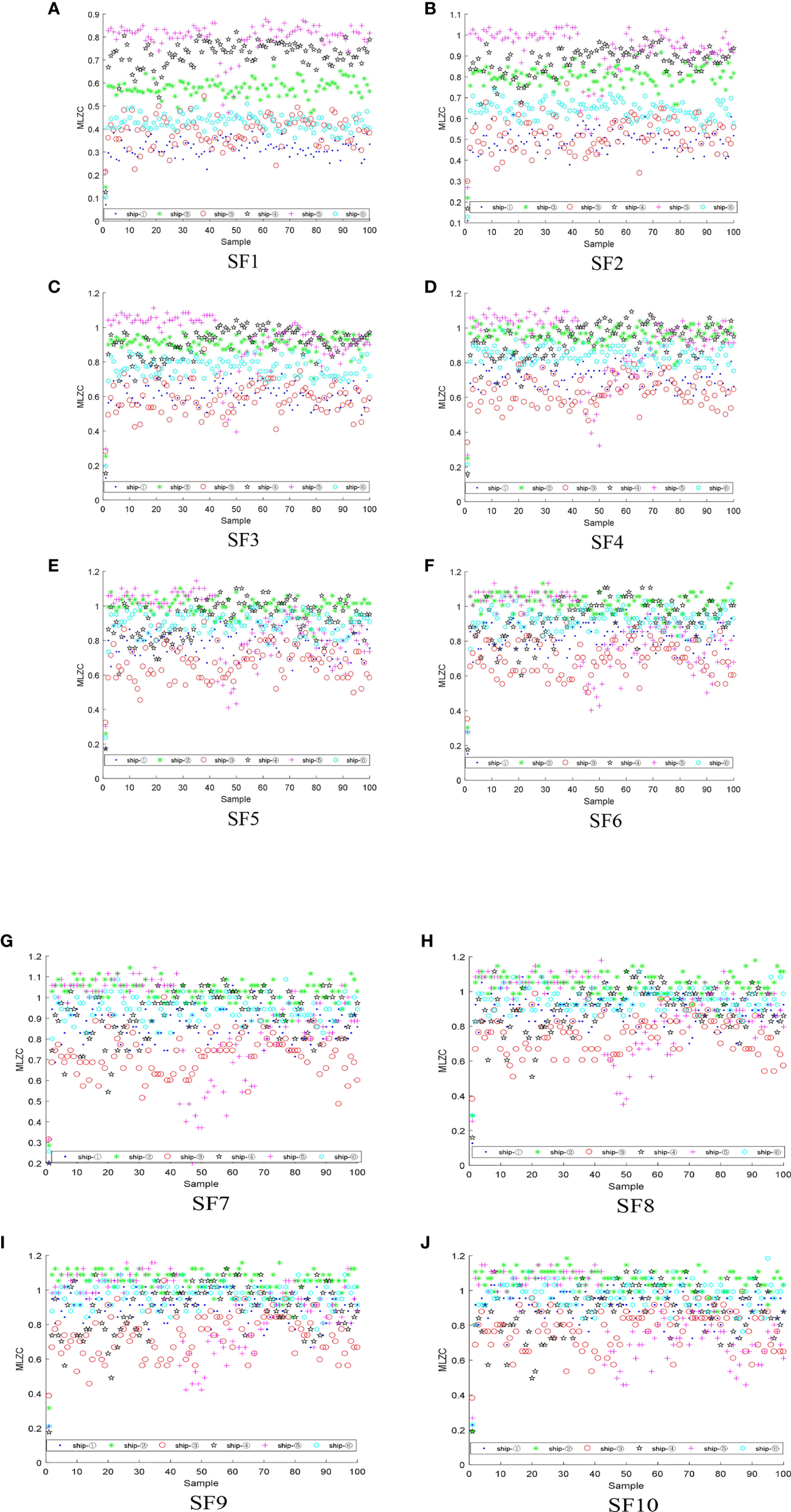 The feature distributions of MPLZC for six S-Ss under each SF:(A) SF1, (B) SF2, (C) SF3, (D) SF4, (E) SF5, (F) SF6, (G) SF7, (H) SF8, (I) SF9, (J) SF10.