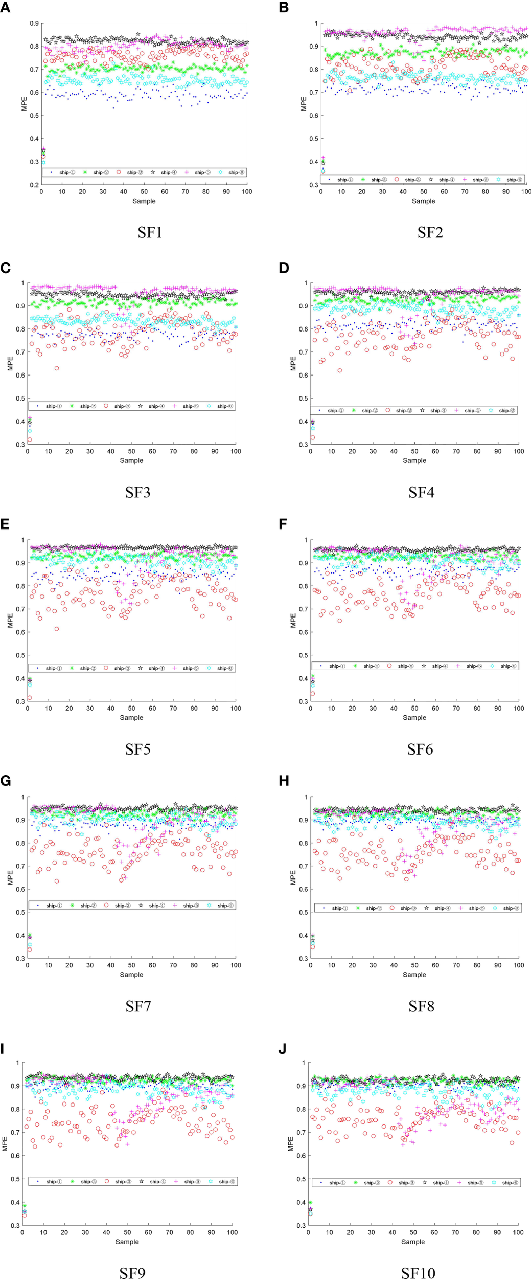 The feature distributions of MPE for six S-Ss under each SF:(A) SF1, (B) SF2, (C) SF3, (D) SF4, (E) SF5, (F) SF6, (G) SF7, (H) SF8, (I) SF9, (J) SF10.