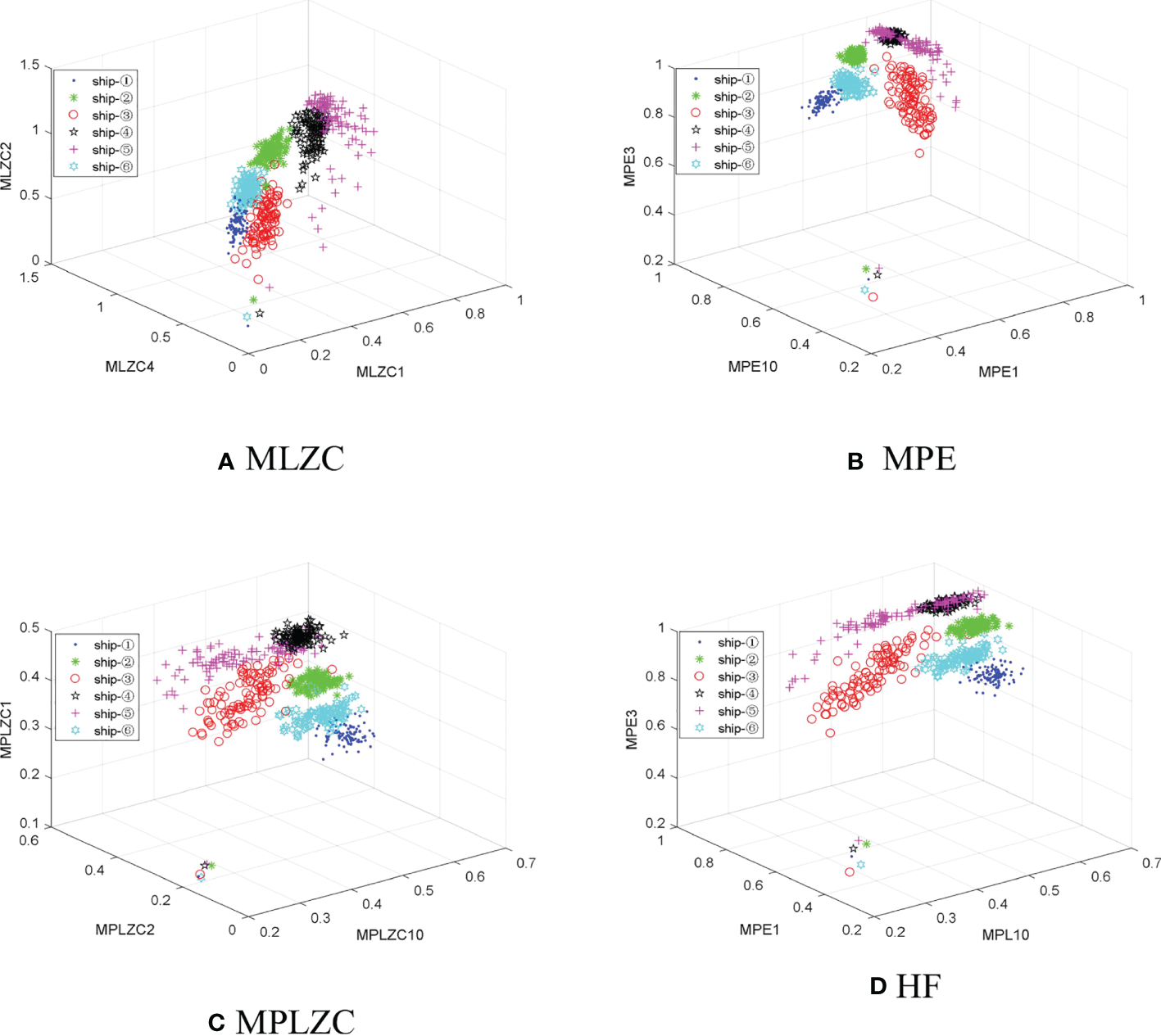 From Figures 7–9, for MLZC, MPE and MPLZC, the overlapping phenomenon of the feature distributions for the six S-Ss gradually became serious with the increase of SF; for MPE and MPLZC, compared with MLZC, the feature dstributions of the six S-Ss have more significant differences under each SF; compared with other SFs, the feature distributions of MPE for six S-Ss have less overlapping parts under SF1, SF2 and SF3, especially ship-② and ship-⑥; from SF4 to SF8, the MPE of ship-④ and ship-⑤ are approximate, which is difficult to distinguish these two S-Ss; for MPLZC, the distinguishing effect between the feature distributions of ship-② and ship-④ under SF2 is better than that under SF1; the difference between the MPLZC of ship-② and ship-③ under SF1 is more obvious than that in SF2; from SF5 to SF10, the MPLZC distributions of ship-② and ship-⑤ are seriously overlapped, which is difficult to distinguish these two S-Ss. In summary, under different SF, MLZC, MPE, and MPLZC also have different ability to distinguish different S-Ss, only the single feature is adopted, which is difficult to distinguish the six S-Ss.