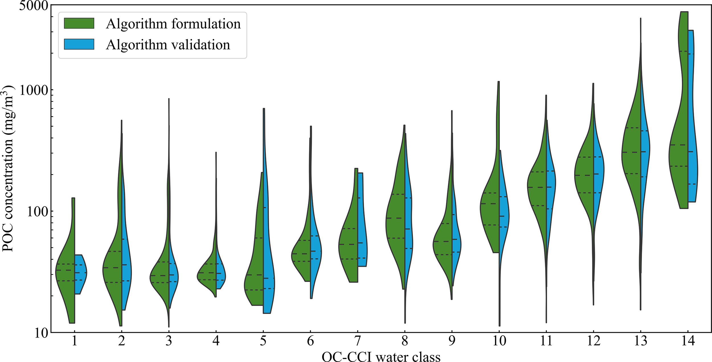 Histogram of POC concentration distribution for algorithm formulation match-ups and algorithm validation match-ups.