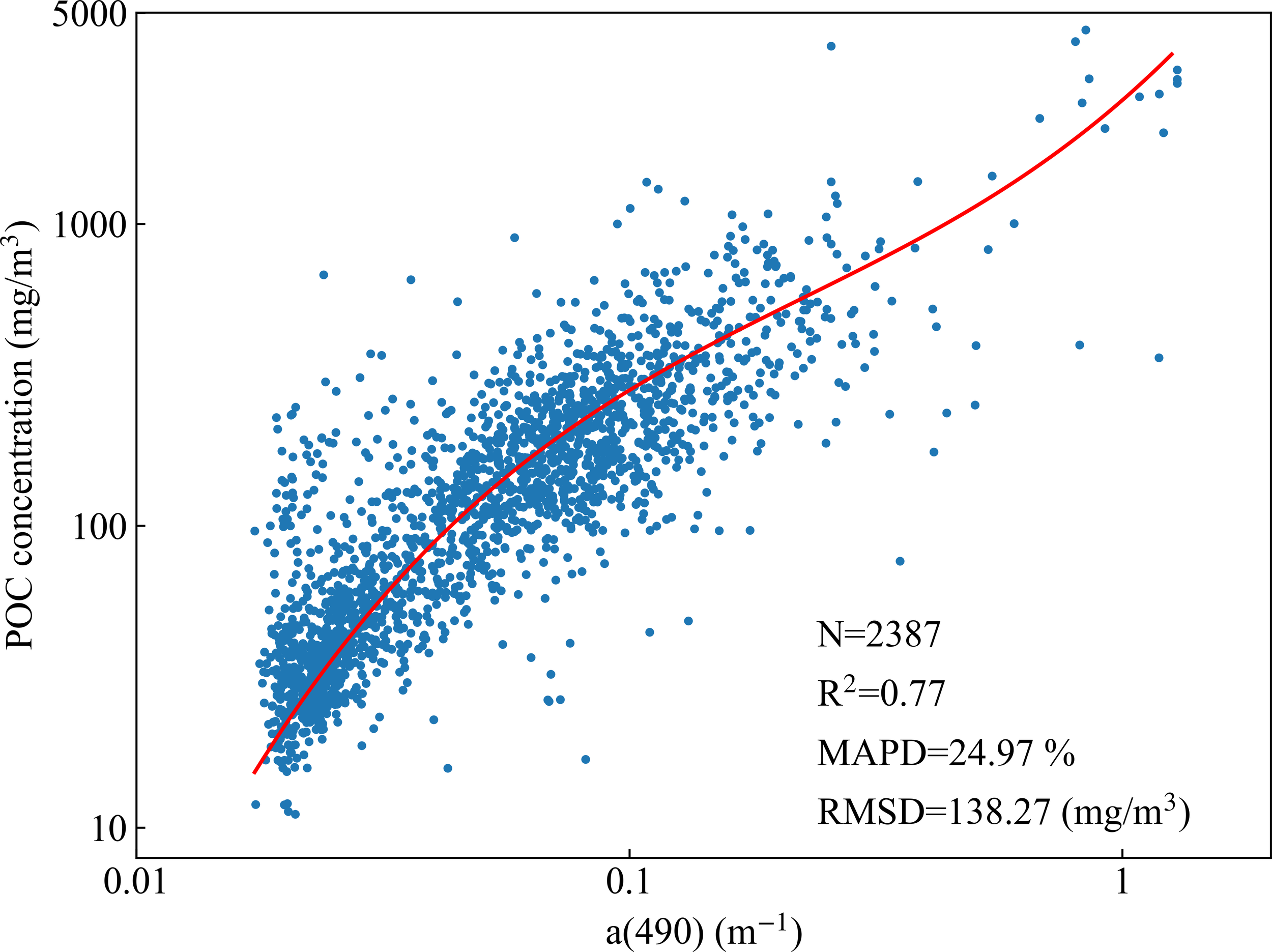 Subscripts w, Φ, NAP, and CDOM represent pure seawater, phytoplankton, nonalgal particles, and colored dissolved organic matter. Selecting a(λ) as a proxy for POC can describe the variability in phytoplankton and nonalgal particles, although doing so also mingled with the signal of CDOM, especially in coastal waters. Since the absorption coefficient of CDOM (aCDOM) decays exponentially with increasing wavelength (Babin et al., 2003), this study focused on the relationship between a(490) and POC concentration. The OC-CCI data was combined with a global in situ POC dataset to establish an absorption-coefficient-based POC concentration retrieval algorithm (a-POC). Afterward, the performance of the a-POC algorithm was compared with that of the BG algorithm on a global and regional scale, and an uncertainty map was plotted. Finally, the a-POC algorithm was applied to other sensors, and its universality was evaluated.
