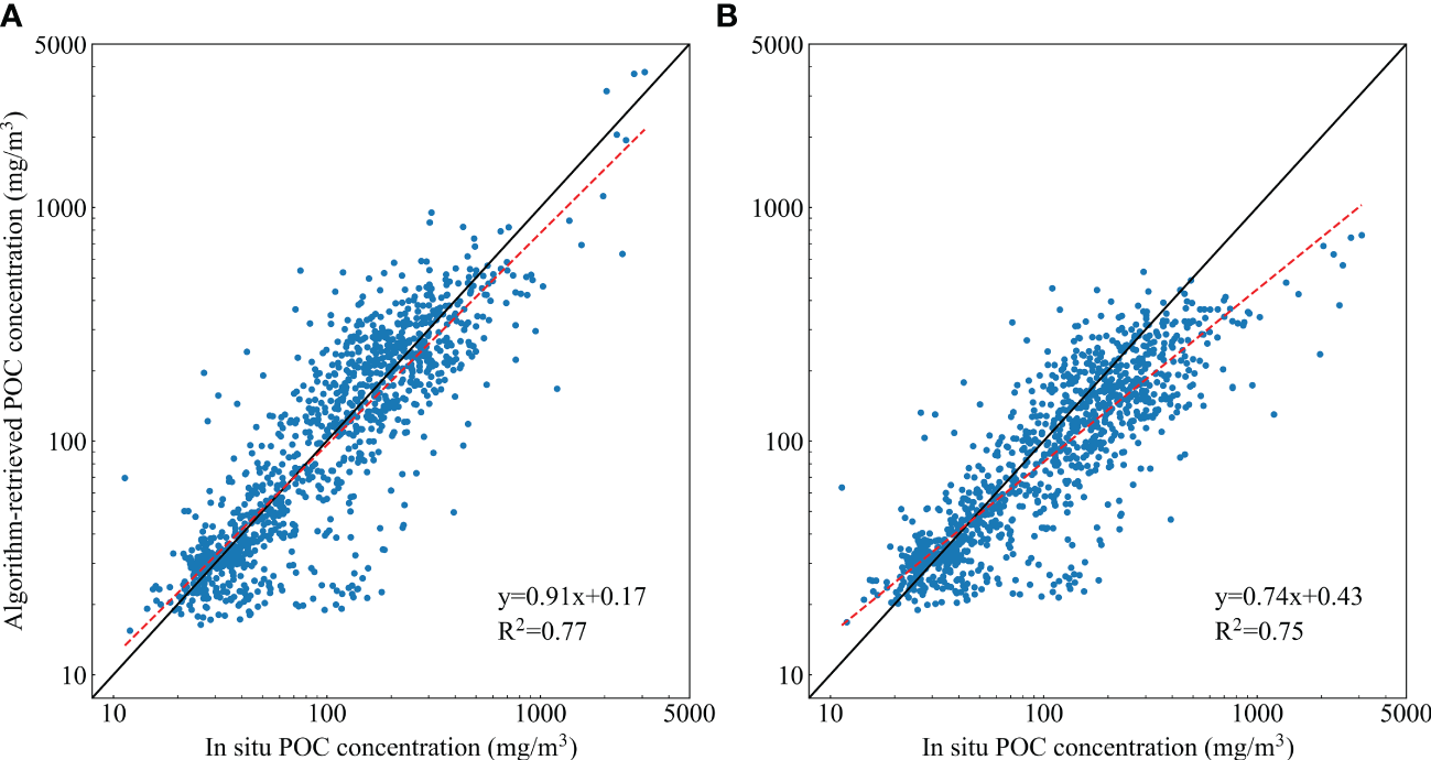 Correlation between in situ POC concentrations and the concentrations retrieved by (A) a-POC algorithm and (B) BG algorithm on the log10 scale. The solid black line represents the 1: 1 line, and the red dashed line represents the corresponding linear regression line for each algorithm. The optimal linear regression equation (y) and the square of the determining coefficient (R2) on the log10 scale are also presented.