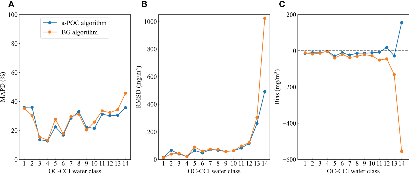The performance of the a-POC algorithm is further evaluated to respond to the regional optimization of user groups and the calculation of per-pixel uncertainty. Figure 7 summarizes the statistical metrics of a-POC and BG algorithms per OC-CCI water class. Water classes 1-6 represent cleaner open oceans, and 12-14 represent coastal waters with high scattering characteristics. The algorithms performed differently in different water classes. When water classes were less than 13, both algorithms showed lower error levels, indicating that the algorithms perform similarly in open oceans and slightly turbid waters. The a-POC algorithm performed better in classes 13 and 14 (i.e., high turbid waters), especially in class 14, which represents the most optically complex waters. In contrast, the BG algorithm heavily underestimated POC concentrations in these classes.