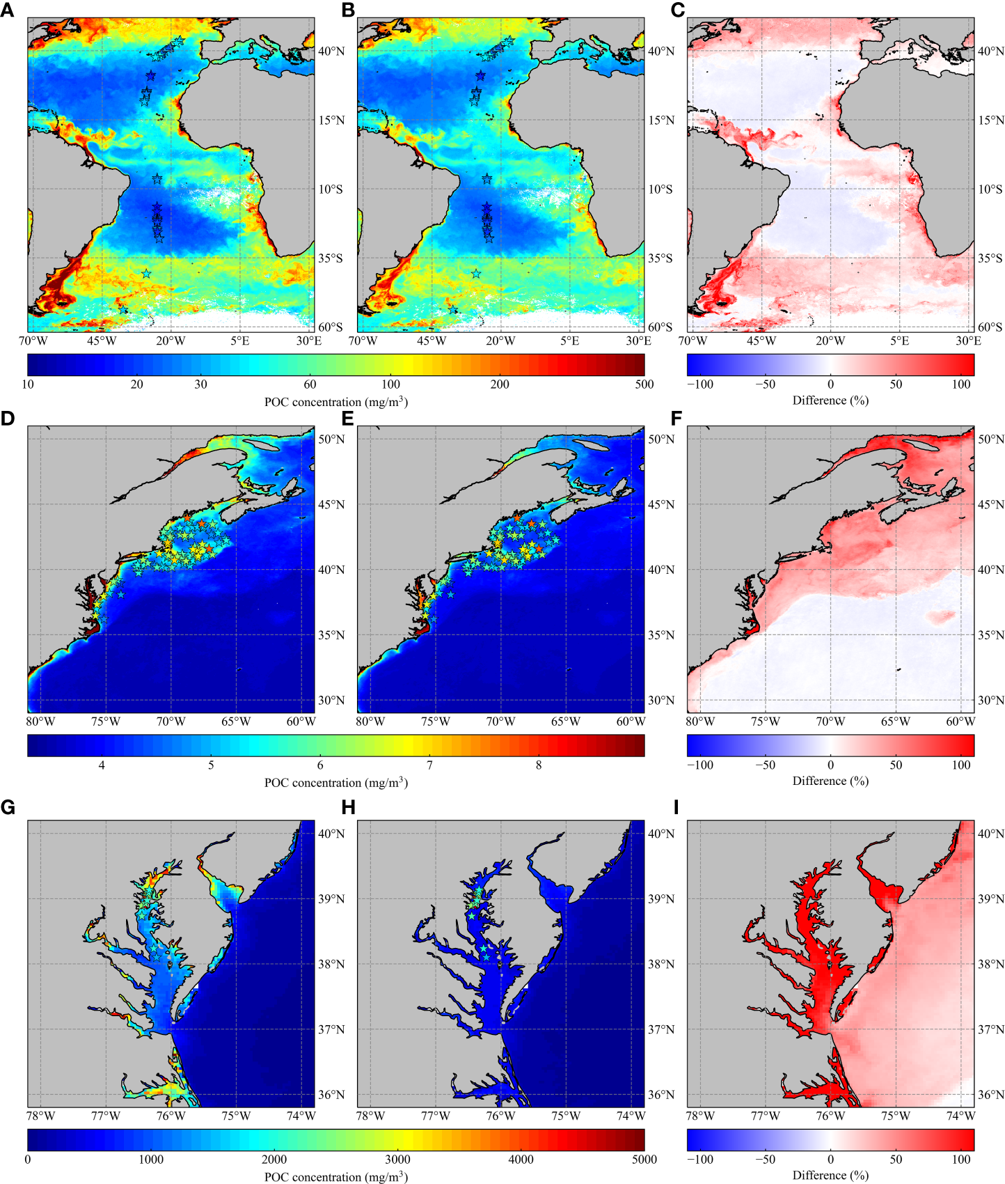POC concentration distributions, including match-ups associated with (A–C) the Atlantic Meridional Transect 26 (AMT26), (D–F) the CLIVEC-CV6, and (G–I) the Chesapeake Bay datasets. The colors of scattered points correspond to the bottom color bar showing the POC concentrations of the match-ups. The background maps in (A, B) show the POC concentrations derived from a monthly average composite OC-CCI data in October 2016 using a-POC and BG algorithms, respectively. The patterns of panels (D, E) are similar to those of panels (A, B); background maps were derived in June 2012. The patterns of panels (G, H) are similar to those of panels (A, B); background maps were derived in July 2011. The percentage difference between the two algorithms is highlighted in (C, F, I), and the color pattern corresponds to the bottom color bar displaying the difference values. The percentage difference is calculated as 100×(POCa−POC−POCBG)/POCBG.