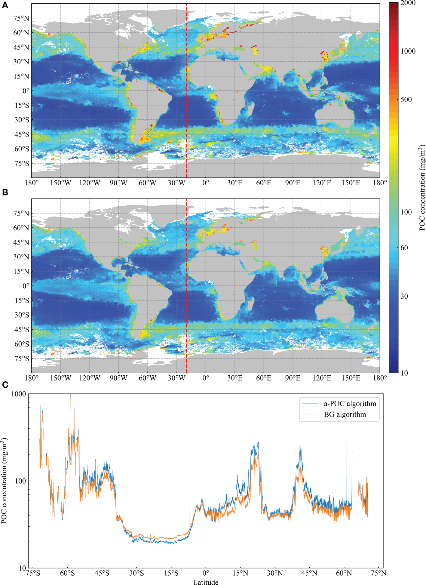 POC concentration distribution retrieved by (A) the a-POC algorithm and (B) the BG algorithm applied to monthly average composite OC-CCI data in March 2020, and (C) the POC concentration distribution along the 20°W transect through the Atlantic Ocean.