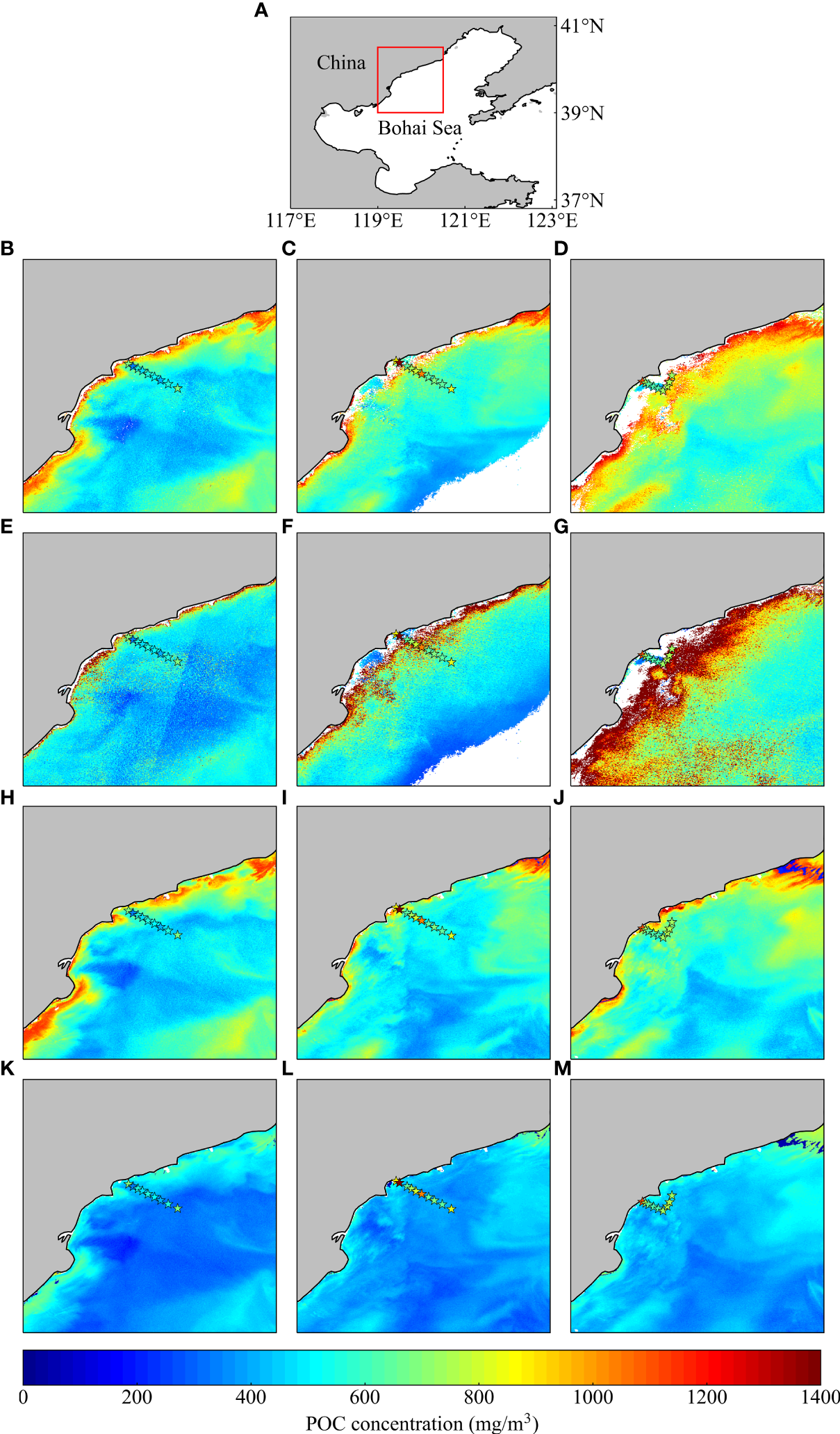 Ocean color remote sensing has the advantages of broad spatial coverage and long time series in obtaining bio-optical properties. It solves the drawback that the data obtained by traditional monitoring methods are dispersed in time and space. In the past few decades, ocean color remote sensing technology has been rapidly developed. For example, the Sea-viewing Wide-Field-of-view Sensor (SeaWiFS), Moderate Resolution Imaging Spectroradiometer (MODIS), Medium-Resolution Imaging Spectrometer (MERIS), Visible Infrared Imaging Radiometer Suite (VIIRS), and Ocean and Land Colour Instrument (OLCI) can send ocean color data to ground receiving stations almost every day. By applying specific retrieval algorithms to remote sensing data, ocean color remote sensing technology can obtain the distribution of oceanic POC concentrations on temporal and spatial scales (Loisel et al., 2002; Stramska and Stramski, 2005; Allison et al., 2010; Duforêt-Gaurier et al., 2010; Stramska, 2014; Stramska and Cieszyńska, 2015; Stramski et al., 2022).