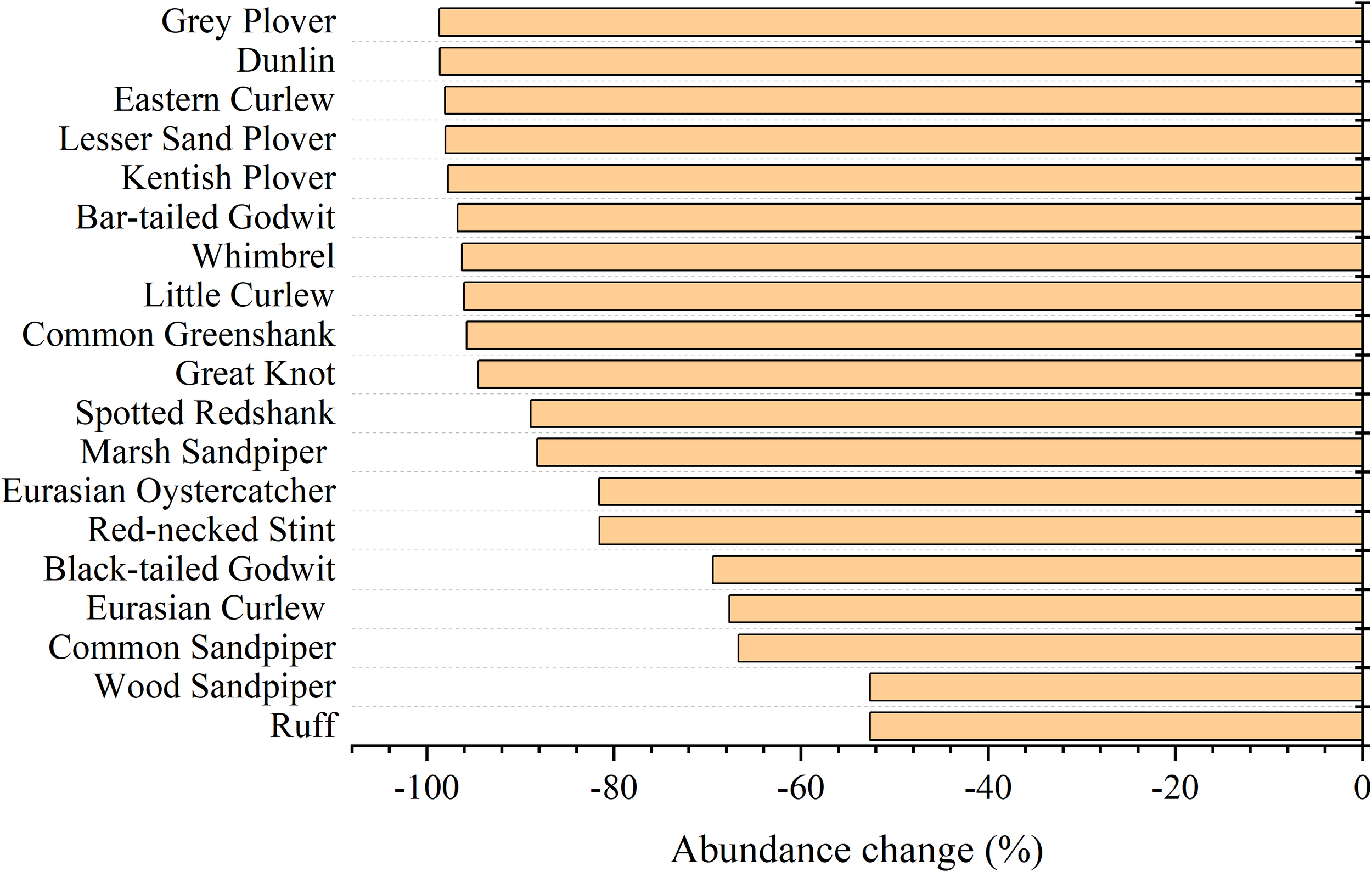 The Yellow River Delta (YRD) is the largest estuarine wetland along the coasts of the Yellow and Bohai Seas. Shorebird populations of more than 20 species in the YRD meet the Ramsar 1% criterion (exceeding 1% of the total population in the flyway) (Xia et al., 2016). There is an inevitable conflict between land development and habitat conservation (Hou et al., 2021). We used shorebird survey data and land-use data to characterize the effects of long-term habitat change (1995–2020) on shorebird populations in the YRD. We hypothesized that habitat changes pose a more serious threat to threatened species, larger-bodied species, and coastal specialist species than to non-threatened species, smaller-bodied species, and generalist/inland specialist species. The findings of this study provide new insights that could aid the conservation and management of key shorebird habitats.