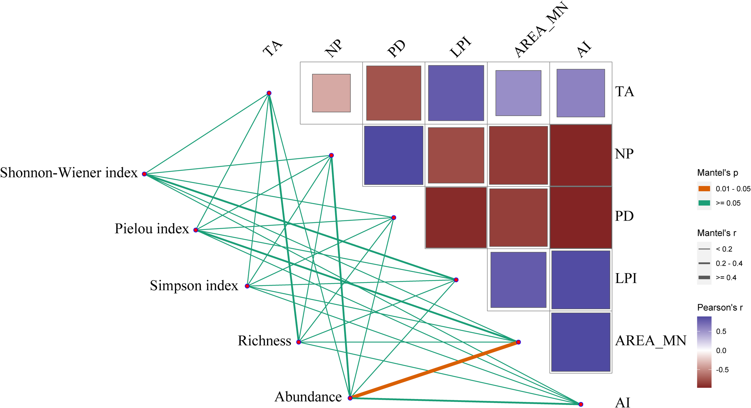 In this study, distance matrices were made using six predictor variables, TA, LPI, AREA_MN, NP, PD, and AI, in 1995, 2000, 2005, 2010, and 2020; distance matrices were also made using five response variables, i.e. richness, abundance, SHDI, E, and D, in 1995, 2000, 2005, 2010, and 2020. Partial Mantel tests were run using the linKET package in R version 4.0.4 (Huang, 2021). Detailed code is available at Figshare (http://doi.org/10.6084/m9.figshare.21406911).