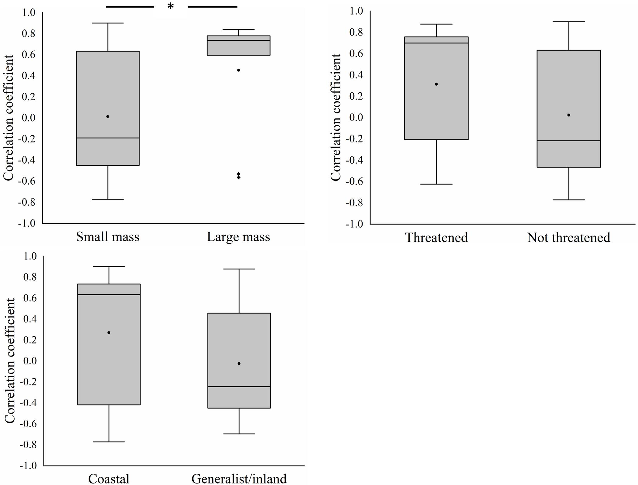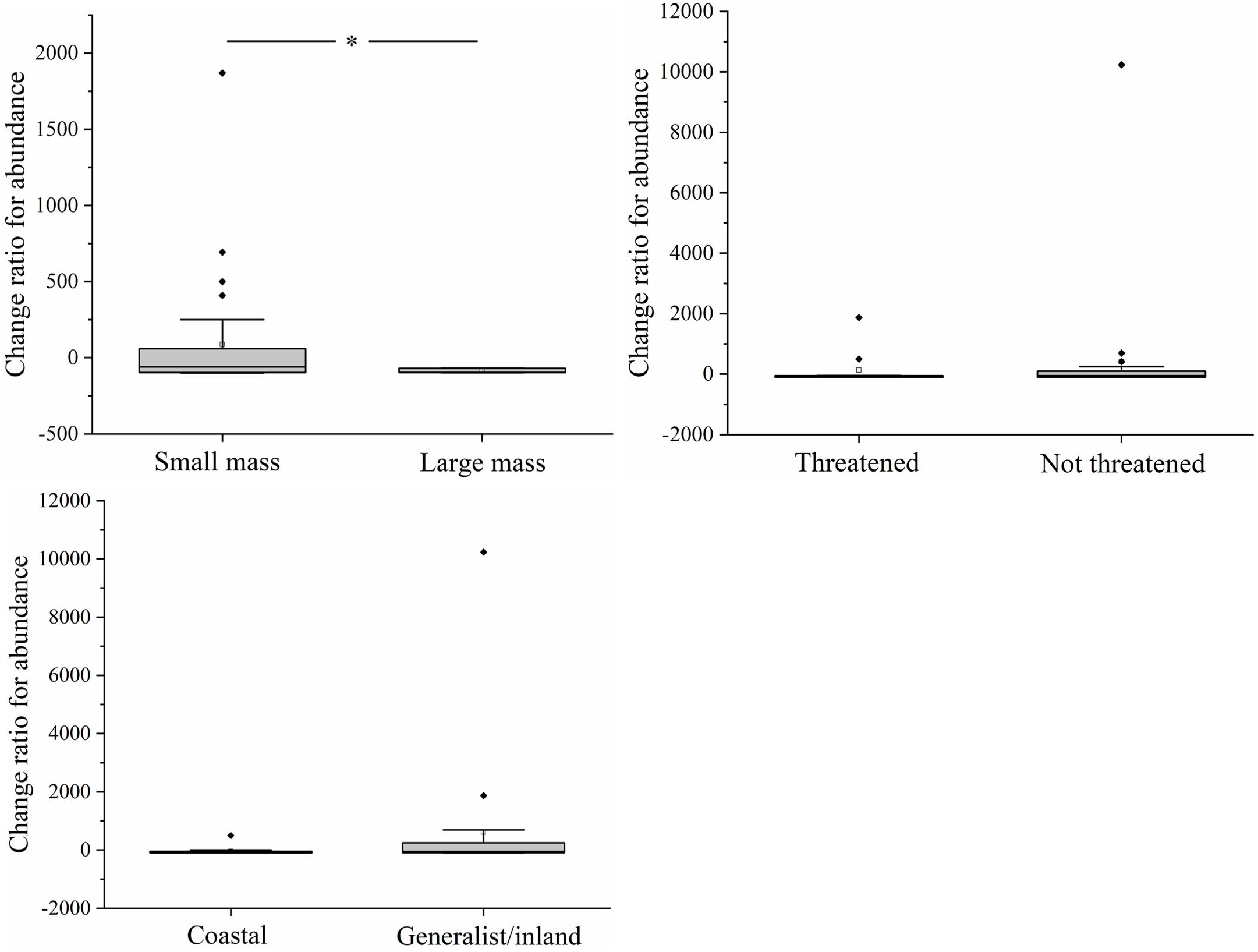 The abundance of threatened species, larger-bodied species, and coastal specialist species is lower than the abundance of non-threatened species, smaller-bodied species, and generalist/inland specialist species in artificial wetlands according to a previous study (Jackson et al., 2020). We thus hypothesized that threatened species, larger-bodied species, and coastal specialist species are more vulnerable to the effects of habitat change.