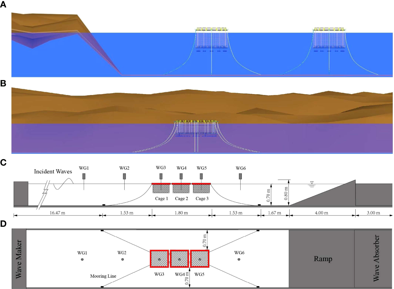 A ramp is used to simplify the depth-varying seabed, as illustrated in Figure 1. Considering the reality of the island, the vertical height of the ramp needs to be greater than the water depth to ensure that the ramp can be exposed to the water. So, we set the height of the ramp to 0.8m. But the length of the wave flume is limited, too small a slope will result in insufficient space for cage mooring. Therefore, referring to Ning’s research (Ning et al., 2022), we set the slope of the ramp to be 1/5 and the corresponding horizontal length of the ramp to be 4m. Plexiglass panels of 0.6 cm are used for the ramp surface. Before the experiment, we design a reasonable frame structure to support the Plexiglas plates and limit their deformation, which is proven to be effective. Simultaneously, five weights of 25 kg are placed at the bottom of the frame to ensure that the ramp remains stable in the flume under the effect of the wave.
