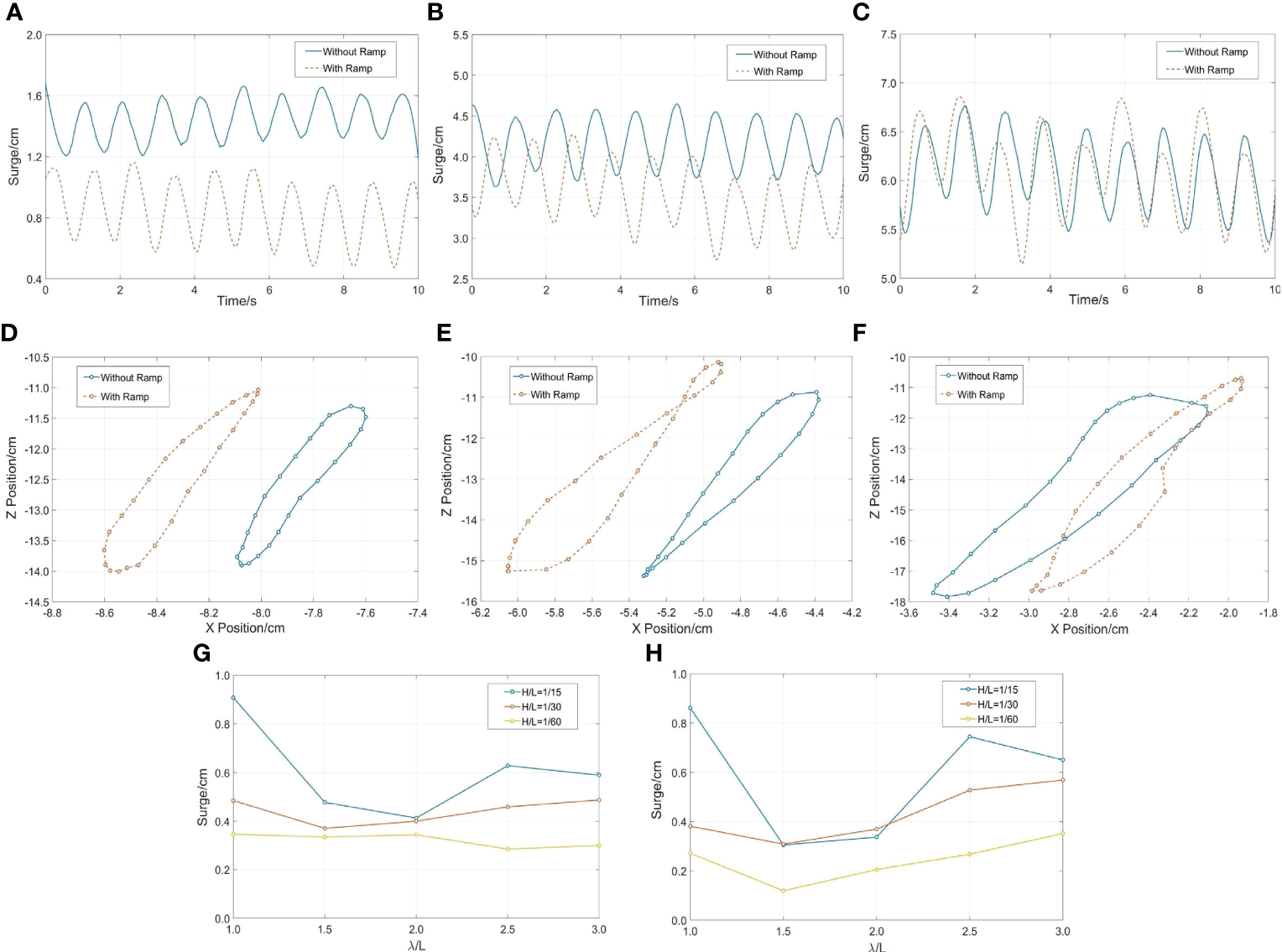 Time histories of the surge motion, trajectories of the cage and dependence of the amplitude of the surge motion on wavelength under different wave steepness: (A, D) H/λ=1/60, λ/L=3; (B, E) H/λ=1/30, λ/L=3; (C, F) H/λ=1/15, λ/L=3, (G) without ramp, (H) with ramp.