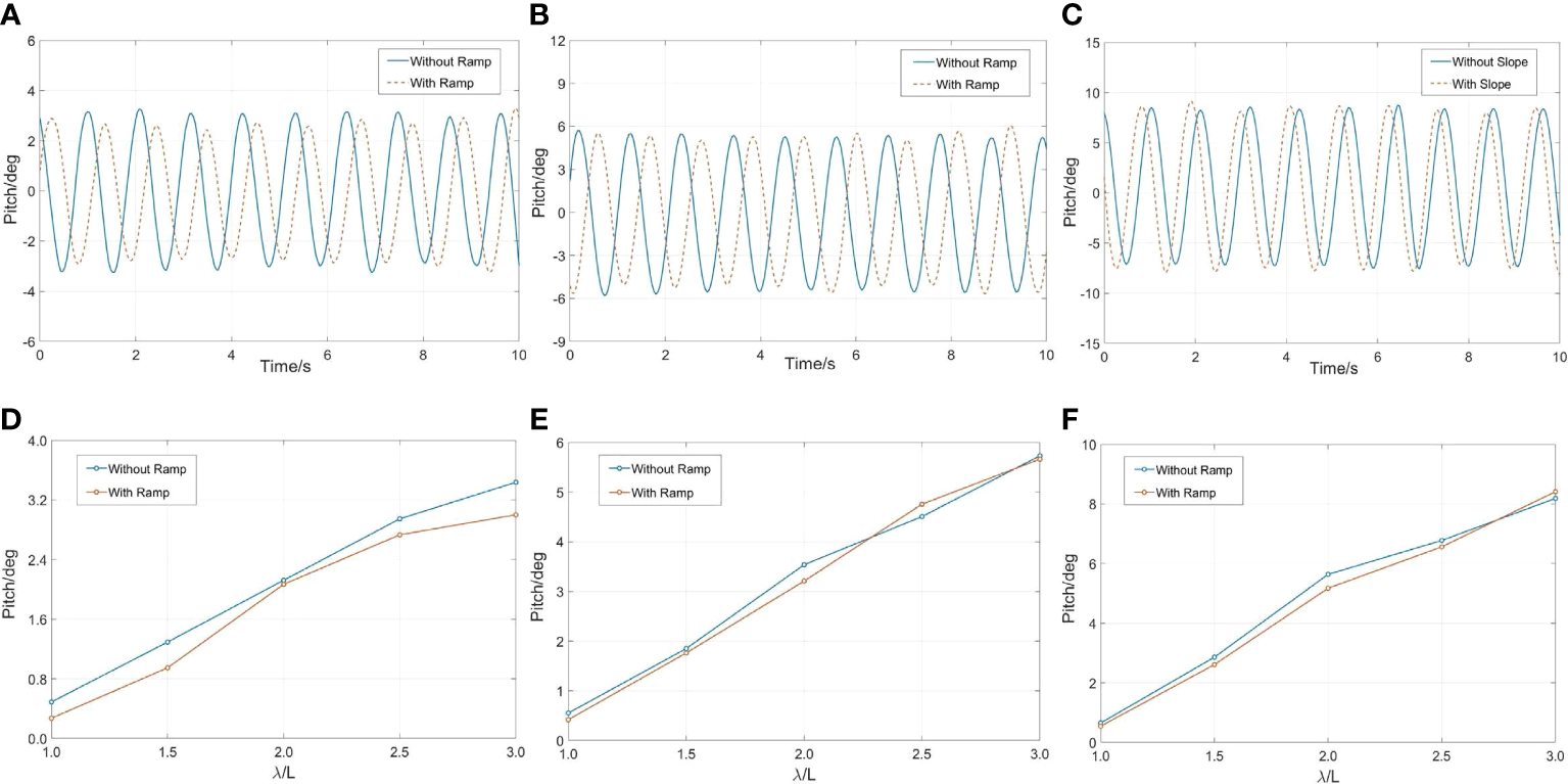 Time histories and the dependence of the amplitude of the pitch motion on wavelength under different wave steepness: (A, D) H/λ=1/60, λ/L=3; (B, E) H/λ=1/30, λ/L=3; (C, F) H/λ=1/15, λ/L=3.