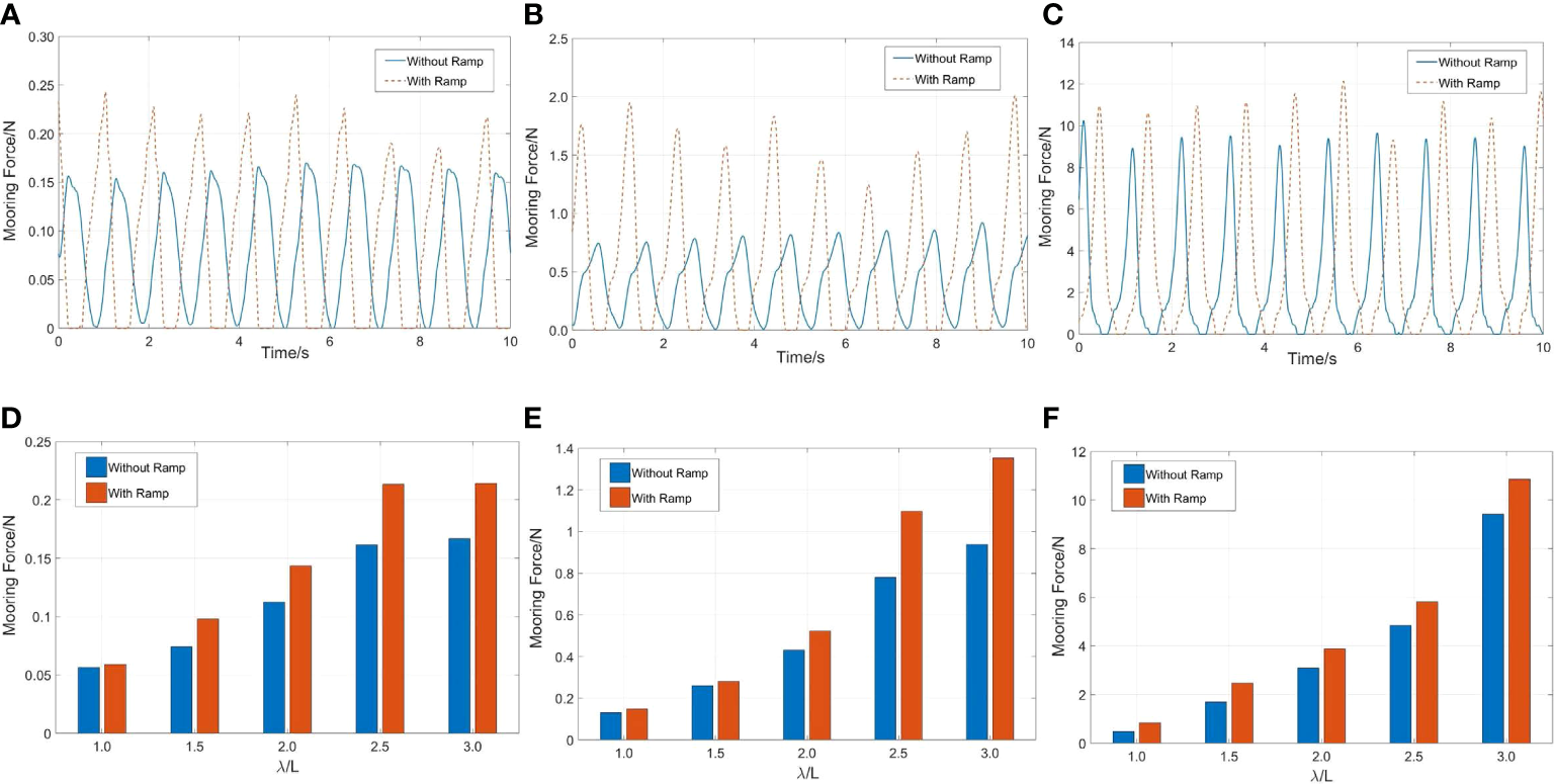 Time histories and the dependence of the peak value of the weather-side cable force on wavelength under different wave steepness:(A, D) H/λ=1/60, λ/L=3; (B, E) H/λ=1/30, λ/L=3; (C, F) H/λ=1/15, λ/L=3.