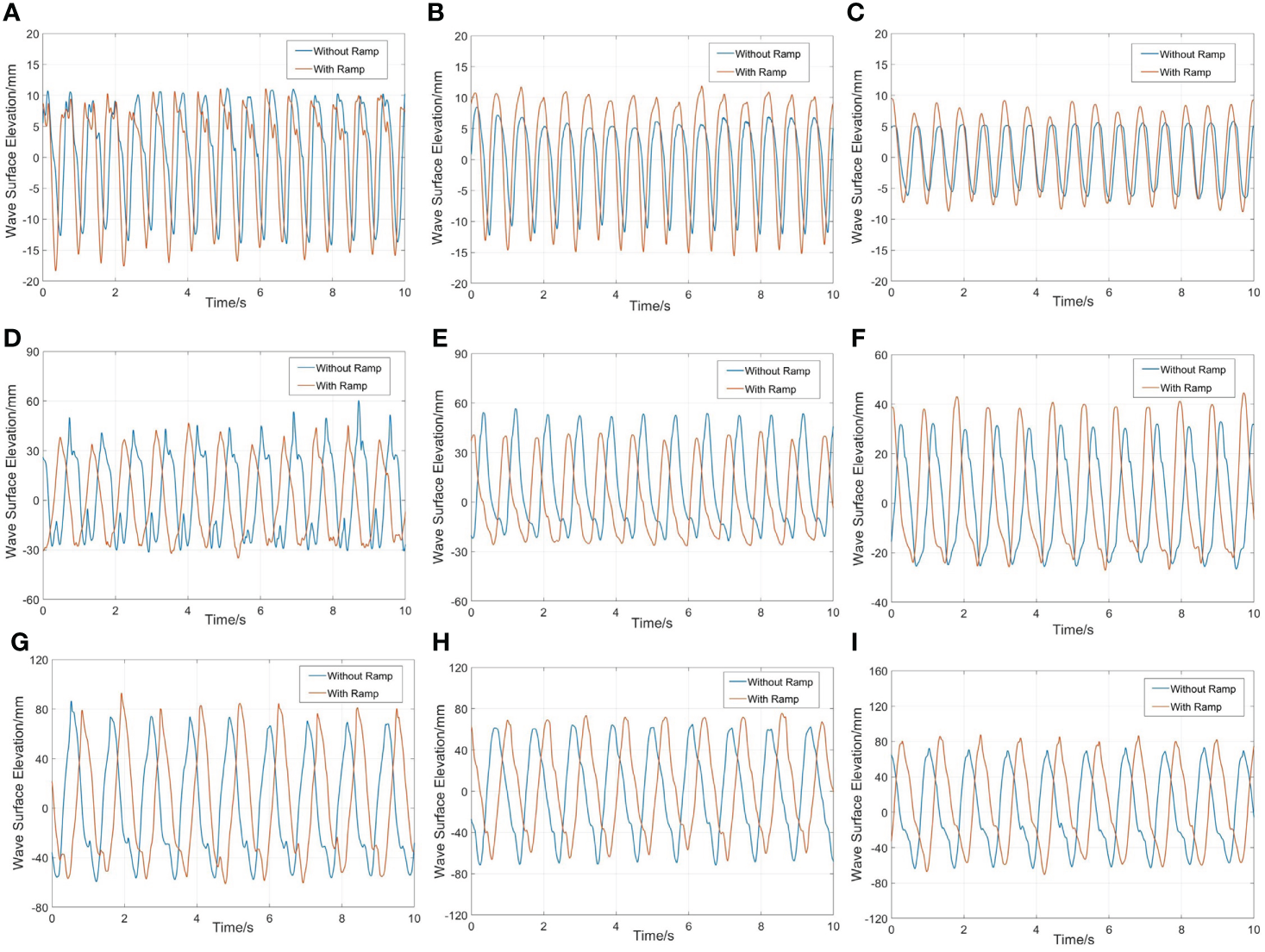 Time histories of the free-surface elevations in different net cages when the wave steepness is 1/15:(A) Cage 1, λ/L=1; (B) Cage 2, λ/L=1; (C) Cage 3, λ/L=1; (D) Cage 1, λ/L=2; (E) Cage 2, λ/L=2; (F) Cage 3, λ/L=2; (G) Cage 1, λ/L=3; (H) Cage 2, λ/L=3; (I) Cage 3, λ/L=3.