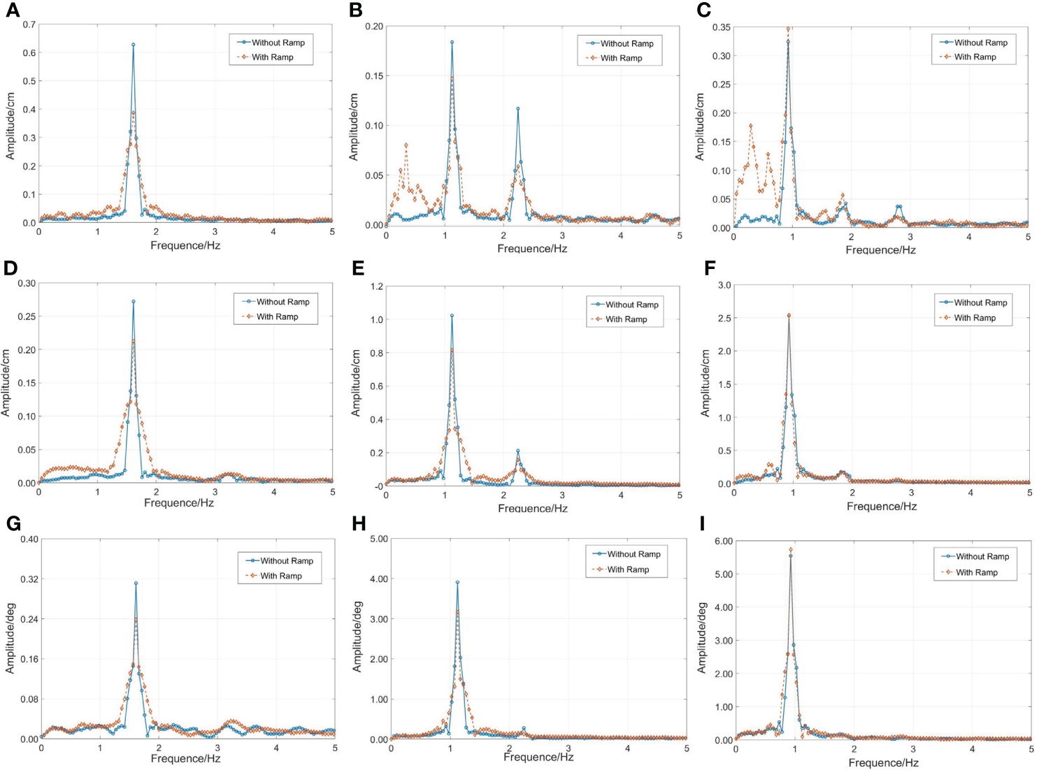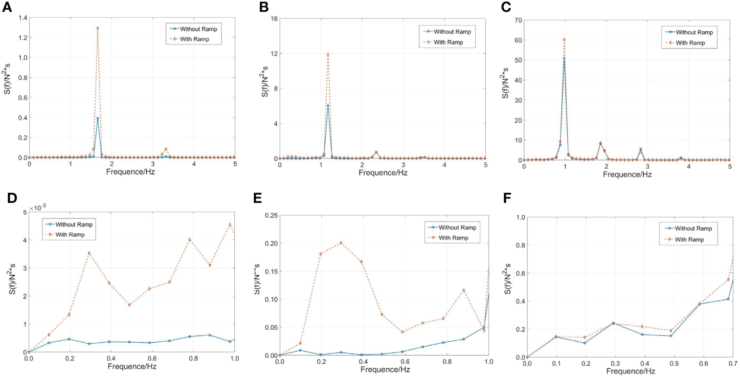 As shown in the Figure 3, we compare the amplitudes of the surge motion under different wave conditions. It can be observed that the surge motion has evident nonlinearity when the effect of the ramp is not considered, which is caused by the material nonlinearity of the nylon cable. The nonlinear stretching mooring strength members develop a permanent, nonelastic length increase under the first loading and respond with nonlinear elastic stretching to applied tensions with a considerably higher elastic modulus at their second and subsequent load cycles (Walther and Gibson, 2000). This trend became increasingly significant as the wave steepness increased.