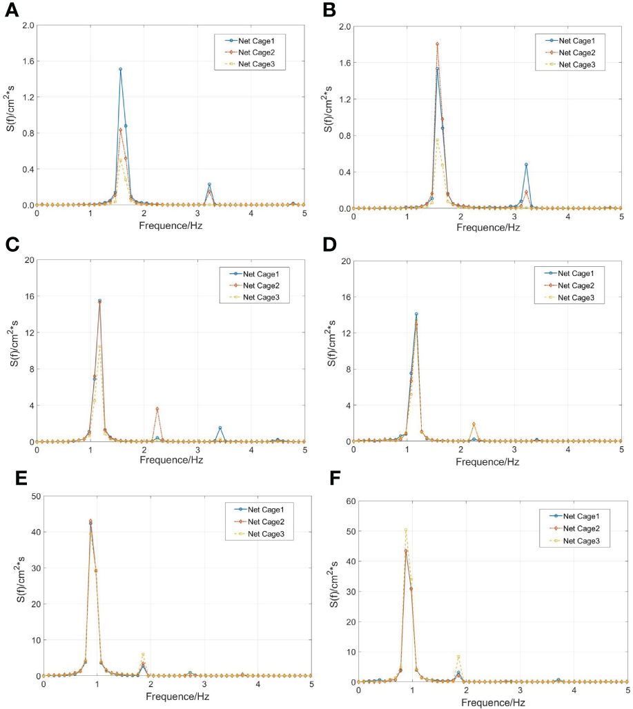 Figures 7A–C shows time histories of the free-surface elevations in different net cages when the wavelength is 0.6 m (λ/L = 1) and the wave steepness is 1/15. The cage on the weather side is defined as Cage 1. The one on the lee side is called Cage 3. The middle one is called Cage 2. The wave response in the cage gradually decreases along the wave propagation direction. Compared with the other two cages, the wave surface in Cage 1 has stronger nonlinearity. This is because there is more significant wave reflection and breaking inside the cage when the incident wavelength is equal to the cage width, as shown in Figure 2C. In addition, the draft of the floating frame is much less than its width (Hdraft/L = 0.02). The wave energy gradually decreases along the wave propagation direction under the influence of turbulence. With the effect of the reflected waves generated by the ramp, the wave elevations have increased by 10.6% in Cage 1, 40.2% in Cage 2 and 38.4% in Cage 3. Compared with other positions, the wave response inside Cage 2 is the largest. And the wave surface inside Cage 1 exhibits stronger nonlinearity because of the ramp.