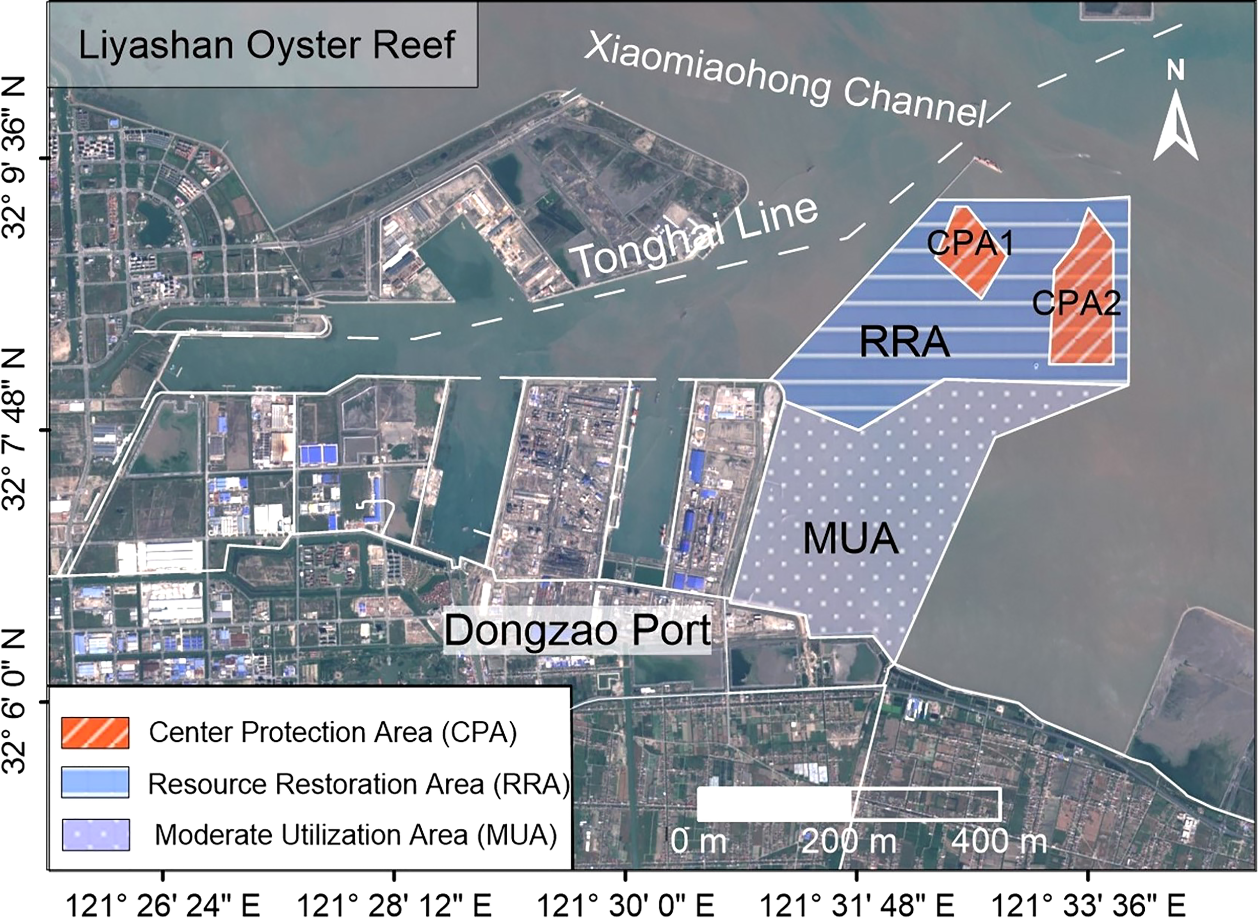 The reef area was divided into three functional areas: the center protection area (CPA), resource restoration area (RRA), and moderate utilization area (MUA), as shown in Figure 3. Oyster reefs and their biological resources are mainly concentrated in the CPA and RRA on the north side, whereas the reefs in the MUA near the shore on the south side are relatively sparsely distributed. The CPA is divided into two major blocks of dense oyster reef areas in the southeast and northwest of the Liyashan Oyster Reefs, which are the key protection zones in the reef area.
