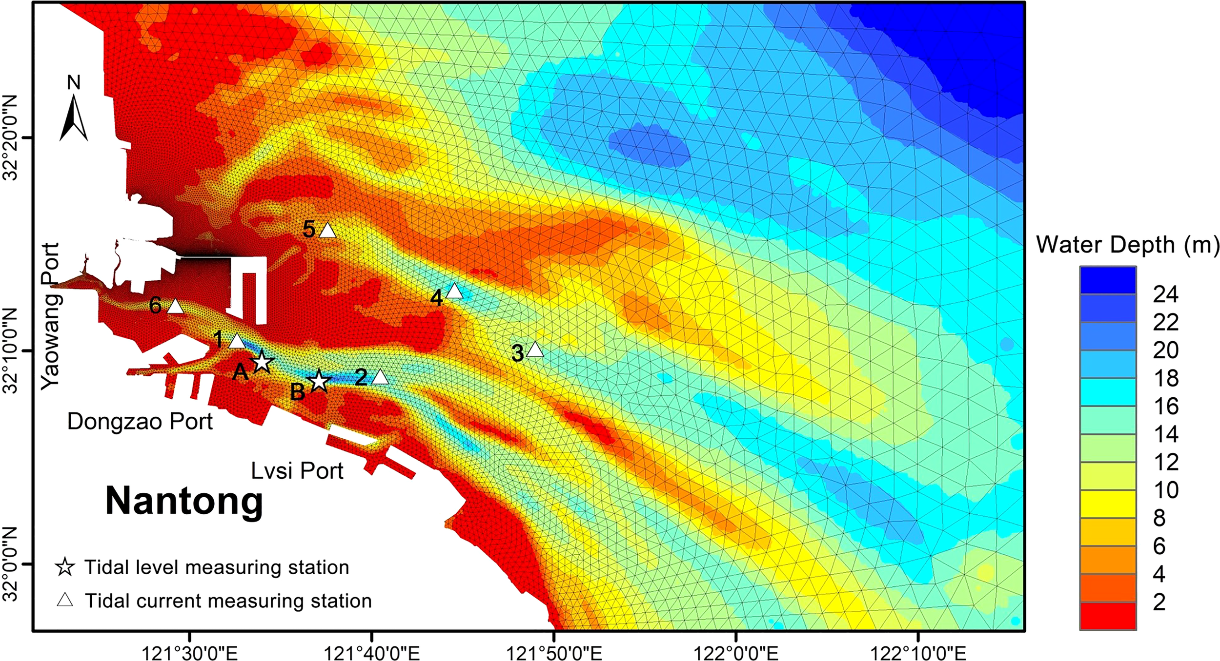 Model grid of study area, and locations of two tidal level measuring stations (A, B) and six tidal current measuring stations (1–6). The model grid is refined in the nearshore waters, and the water depth in the surrounding waters is represented by a gradual change from red to blue. The map also identifies the names of adjacent ports and cities. In addition, the water depth corresponds to the National Vertical Datum 1985.