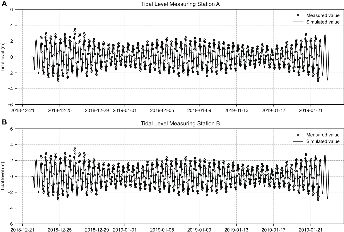 Comparison of tidal level measurement data points with model simulated tidal level fit curves for (A) Tidal Level Measuring Station A and (B) Tidal Level Measuring Station B from December 22, 2018 to January 22, 2019.