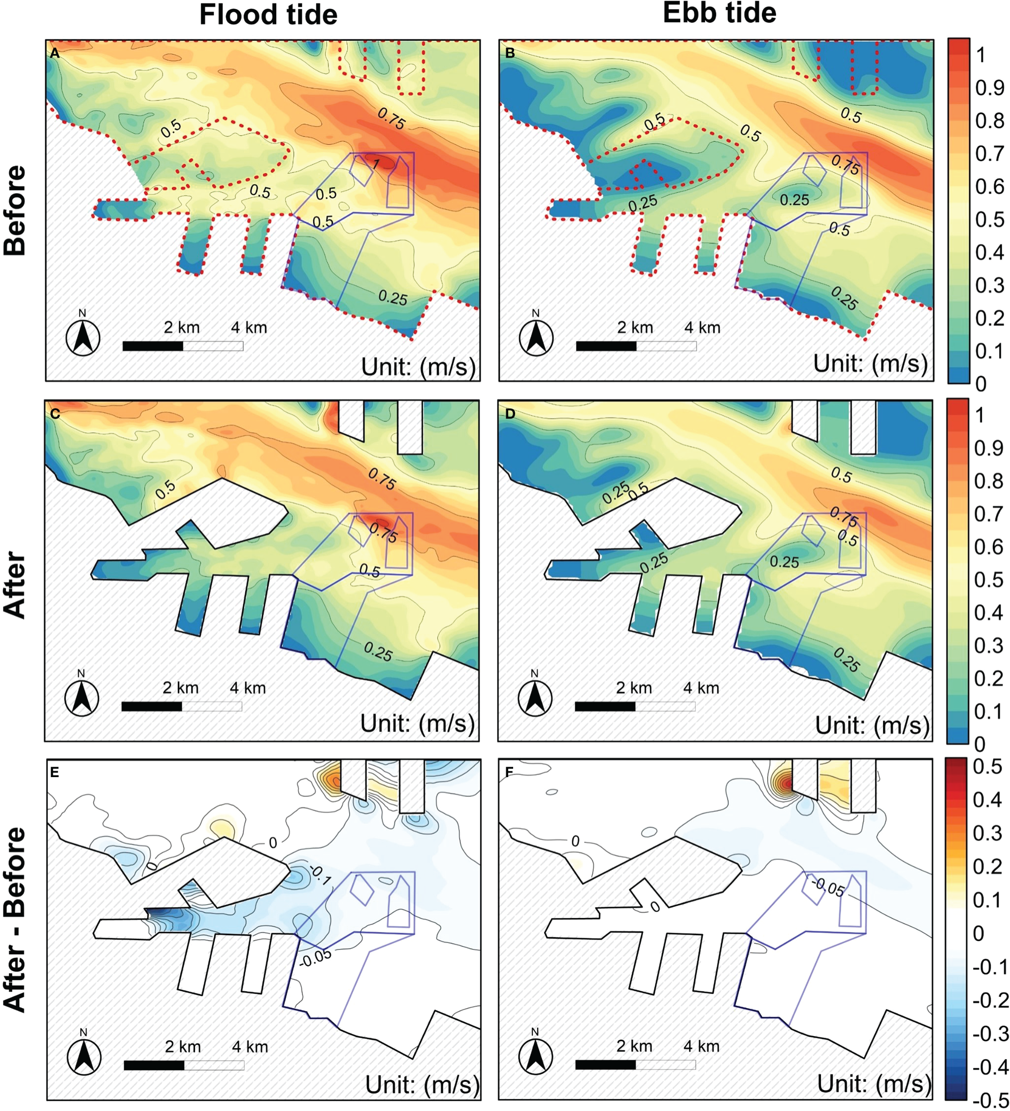 Comparison of bottom flow velocity during spring tide before and after construction of the project. The locations of oyster reefs and their subdivisions are marked on the figures with solid blue lines. Bottom flow velocity distribution during (A) peak flood tide and (B) peak ebb tide of the spring tide before construction of the project. Bottom flow velocity distribution during (C) peak flood tide and (D) peak ebb tide of the spring tide after construction of the project. Difference in bottom flow velocity distribution during (E) peak flood tide and (F) peak ebb tide of the spring tide before and after construction (flow velocity before construction minus flow velocity after construction).