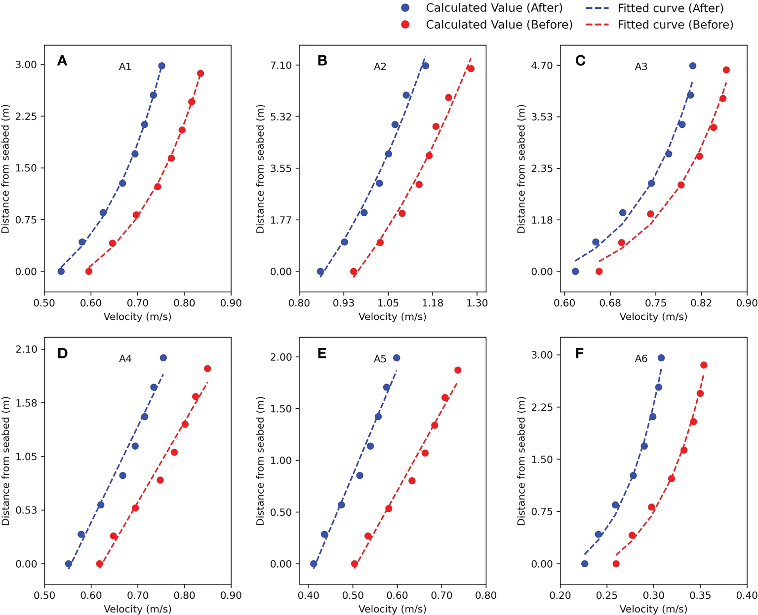 Calculated values and fitted curves of vertical flow velocity at characteristic points of peak flood tide of spring tide before and after human engineering activity. (A–F) Characteristic points A1 to A6.