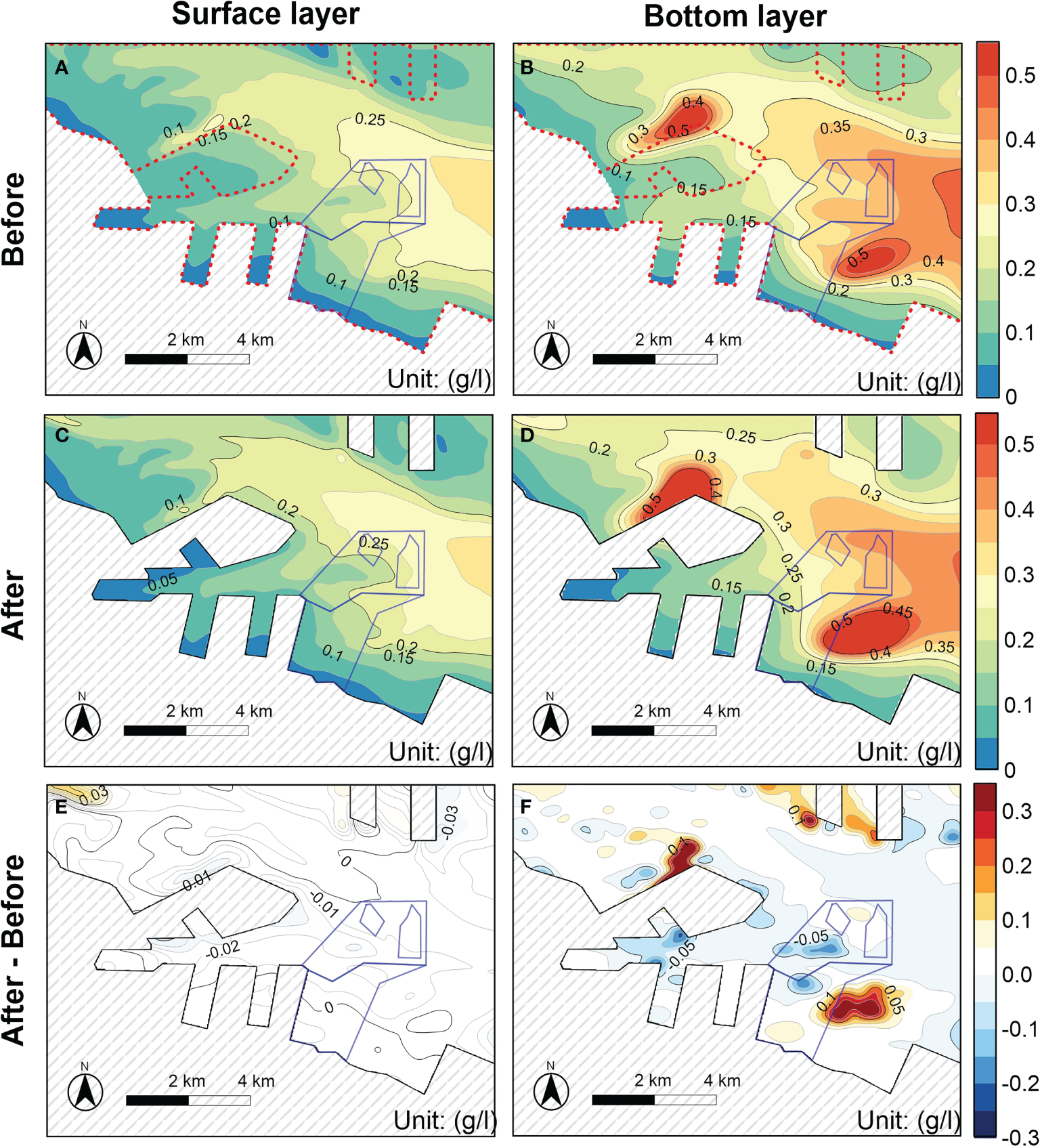 Comparison of surface and bottom sediment concentrations before and after human engineering activity. The locations of oyster reefs and their subdivisions are marked on the figures with solid blue lines. (A) Surface and (B) bottom sediment concentration distribution during the flood tide of spring tide before construction of the project. (C) Surface and (D) bottom sediment concentration distribution during the flood tide of spring tide after construction of the project. Difference in (E) surface and (F) bottom sediment concentration distribution during the flood tide of spring tide before and after construction (sediment concentration before construction minus sediment concentration after construction).