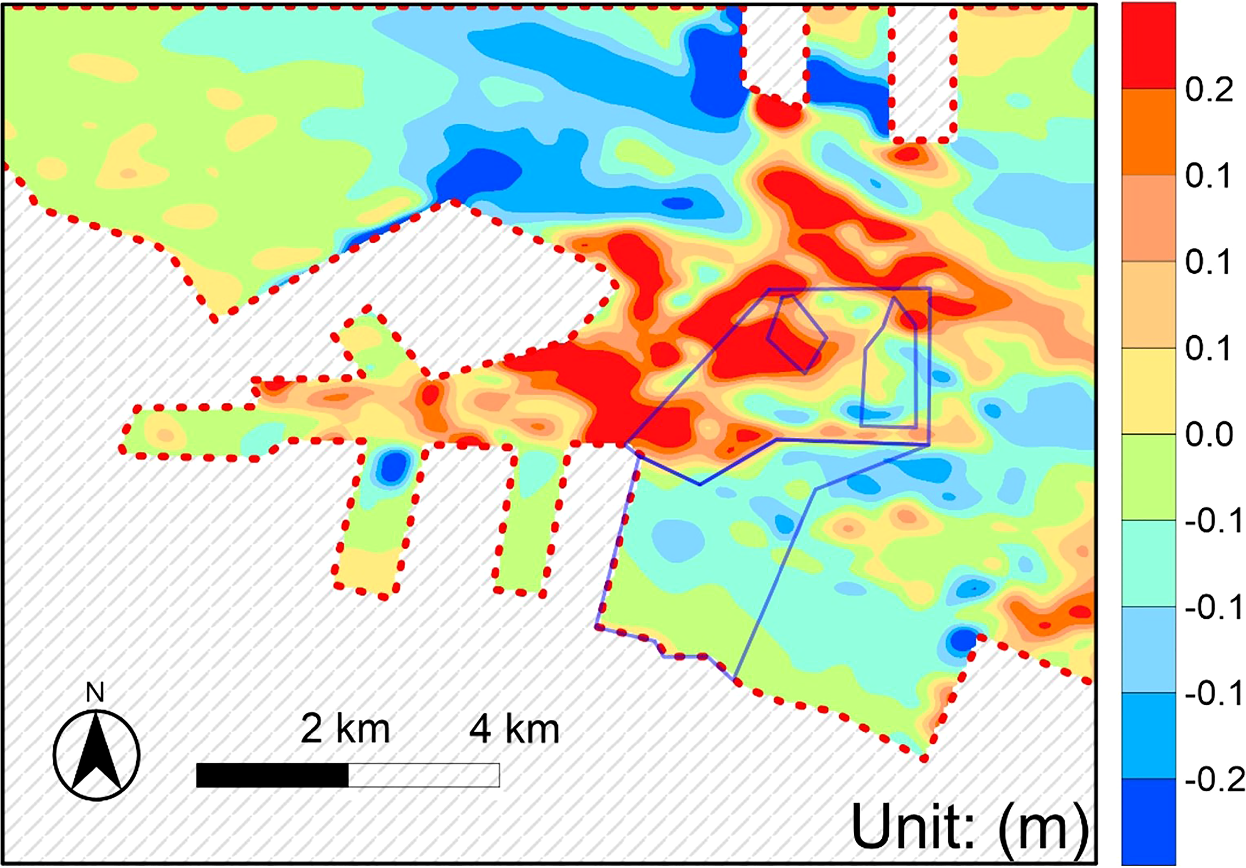 Difference in the distribution of bed-level change in oyster reef waters before (2014) and after (2019) human engineering activity. The locations of oyster reefs and their subdivisions are marked on the figures with solid blue lines. .