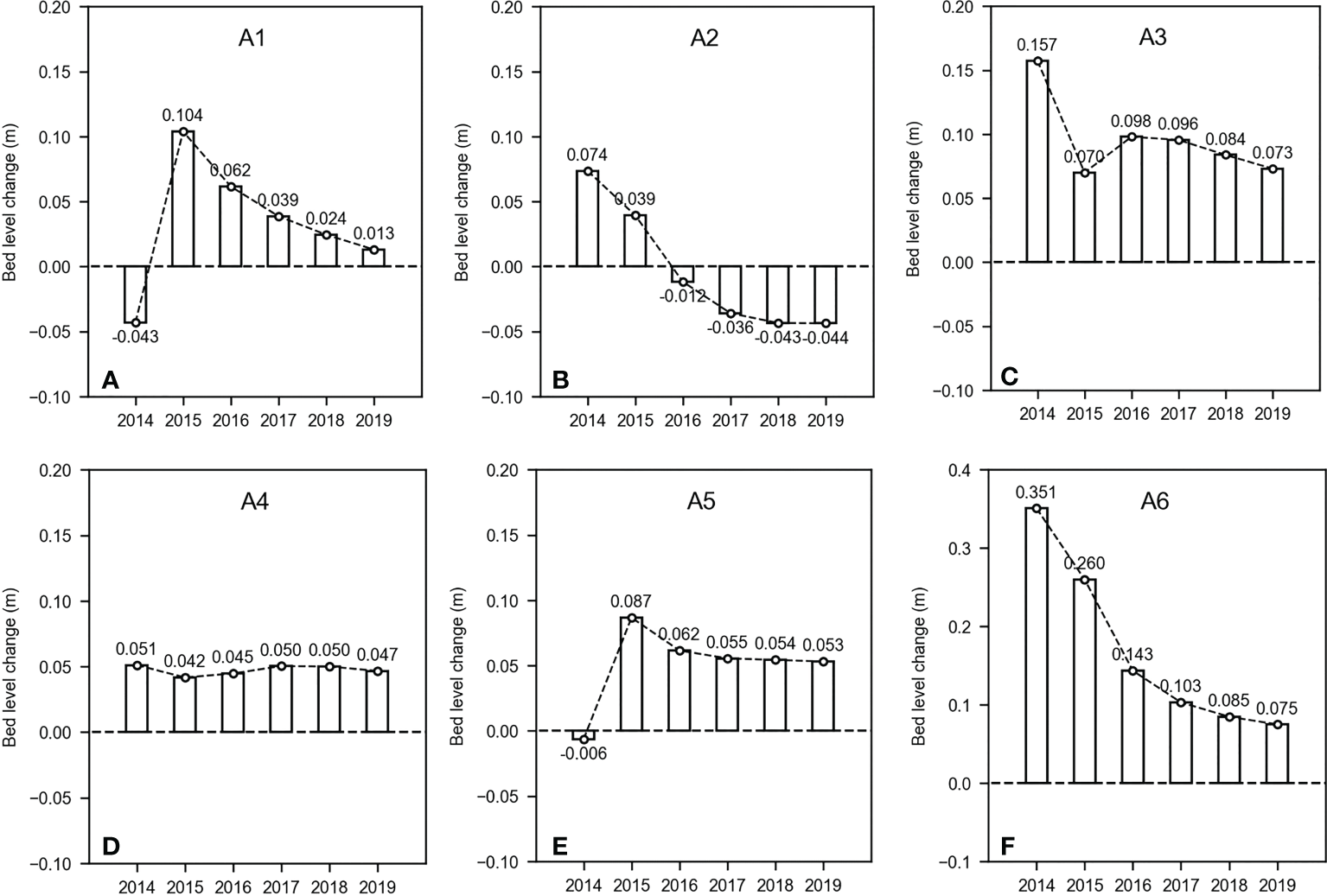 Annual variation of bed-level change intensity at characteristic points before and after human engineering activity. (A–F) Characteristic points A1 to A6.