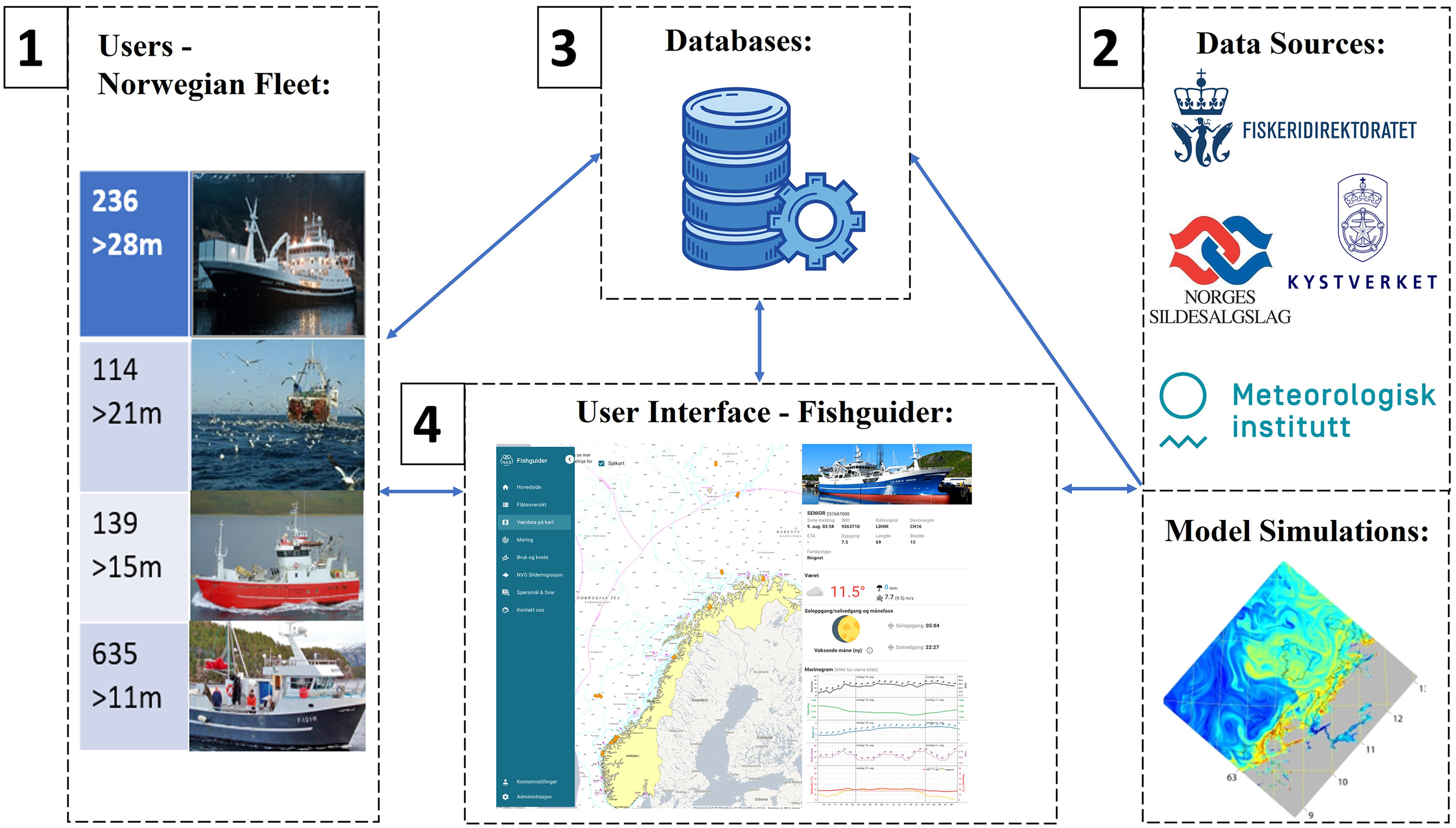 Conceptual model of the Fishguider tool: 1) The Norwegian Fleet of vessels over 11m in length who may contribute information, both from experiential knowledge and from information systems onboard vessels (such as satellite and acoustic data). 2) Fishers can access external information, such as meteorological forecasts, real-time auction prices and relevant model output. 3) The data sources are collected in databases developed in conjunction with the project. 4) The final user interface is a web portal that displays relevant layers to the skipper. The design of the interface is largely driven by the requests of participating fishers.
