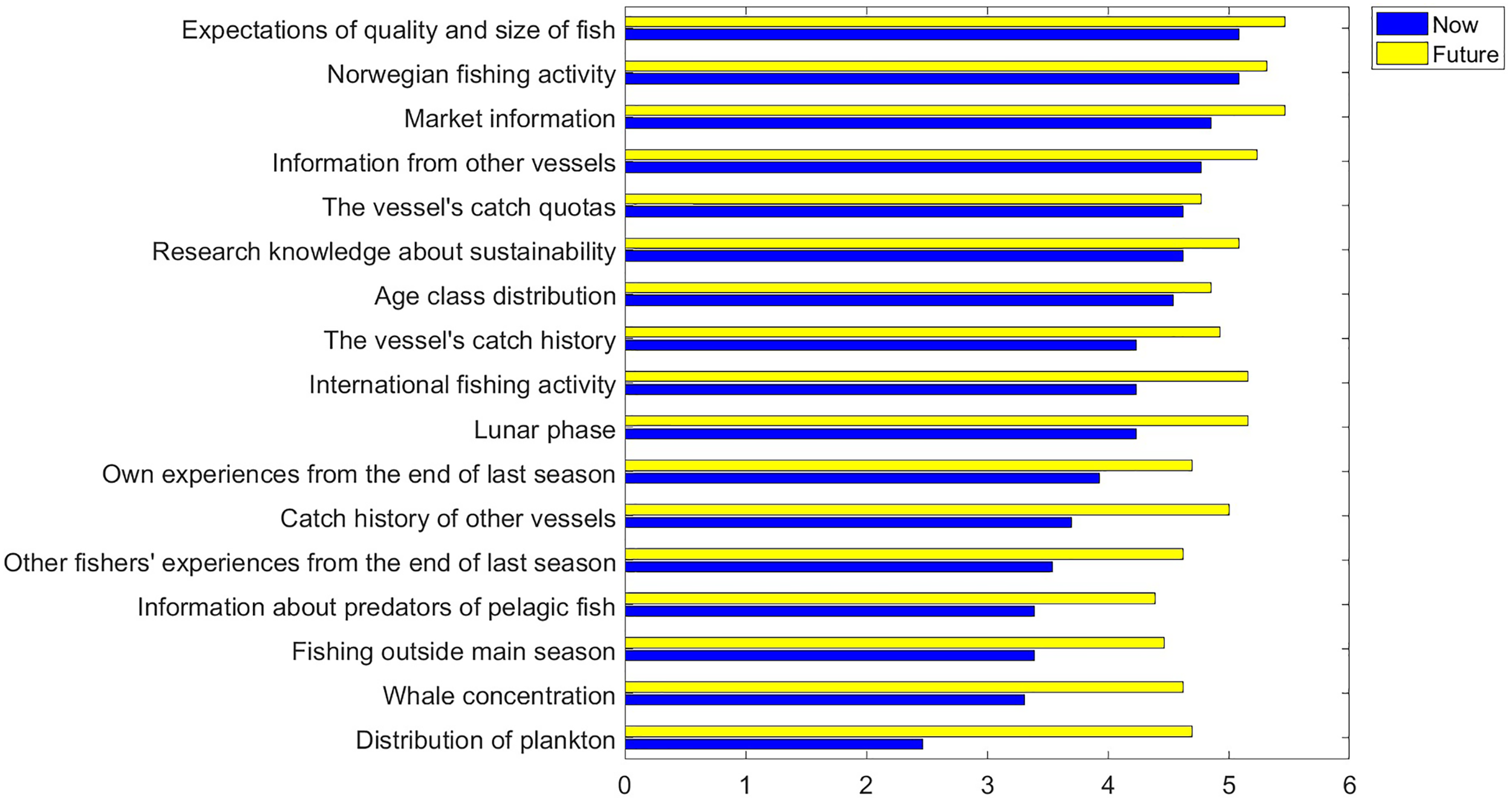 The questionnaire results give insight into what fishers deem important factors in strategic and tactical decision making. However, the small sample size and evaluative scale used means we cannot gauge the prioritization of factors by fishers. Further work should consider ranking factors and matching available knowledge based on this. It is important to avoid the inclusion of all desired sources in the DSS tool at the cost of adequate user experience.