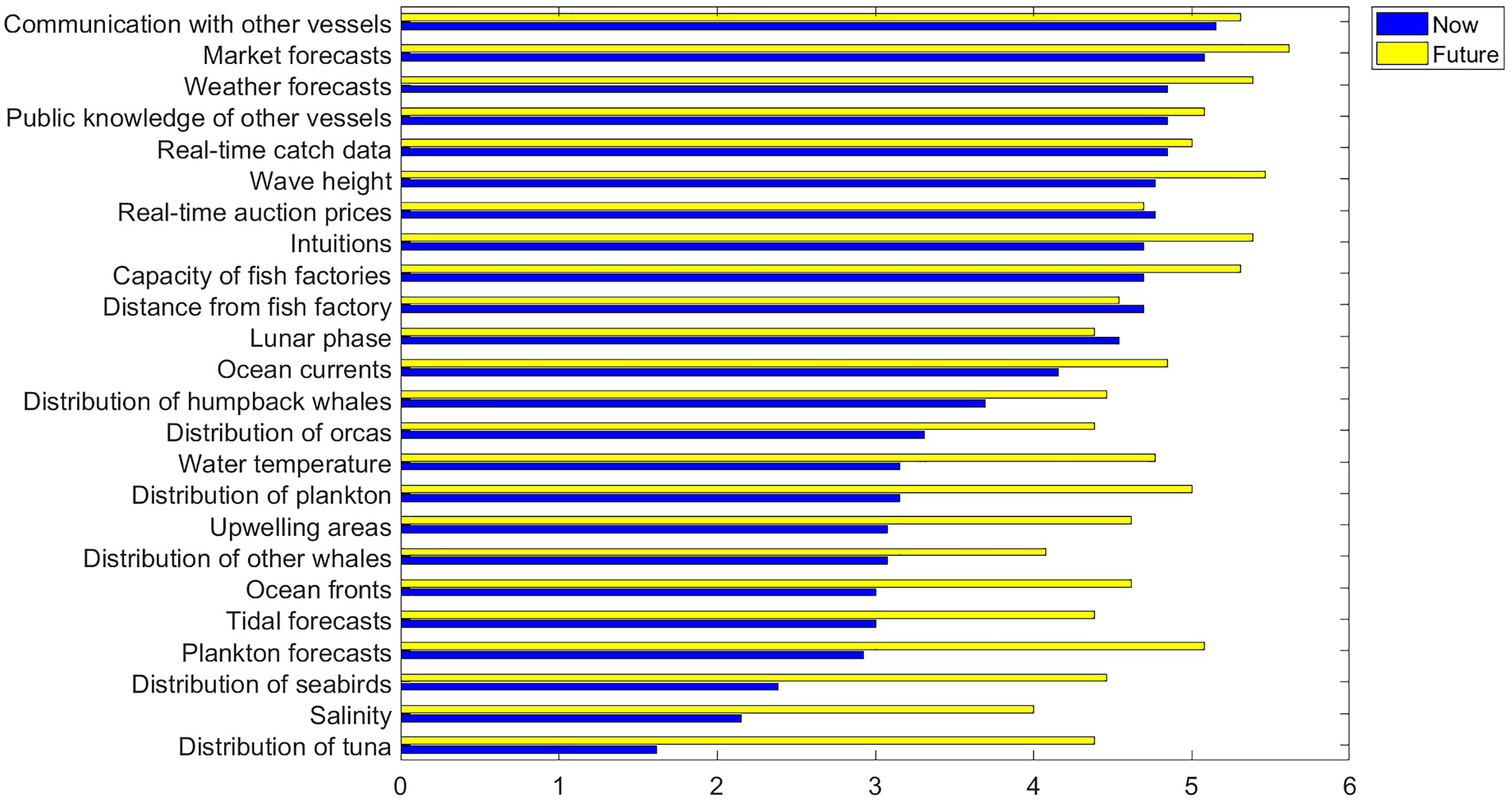 Similarly, when asked what factors are important in tactical decision making, plankton forecasts and distribution of seabirds and whales are not utilized now, but such information may be valuable in the future (Figure 3). It must be noted that the perspective of fishers on the data they use today is likely based on their ongoing assessment of the quality of data available, while the question of future utility is made under the assumption that high quality data may be readily available. In real-time fishing activity, communication with other vessels, market forecasts and weather forecasts are seen as the most important factors to consider.