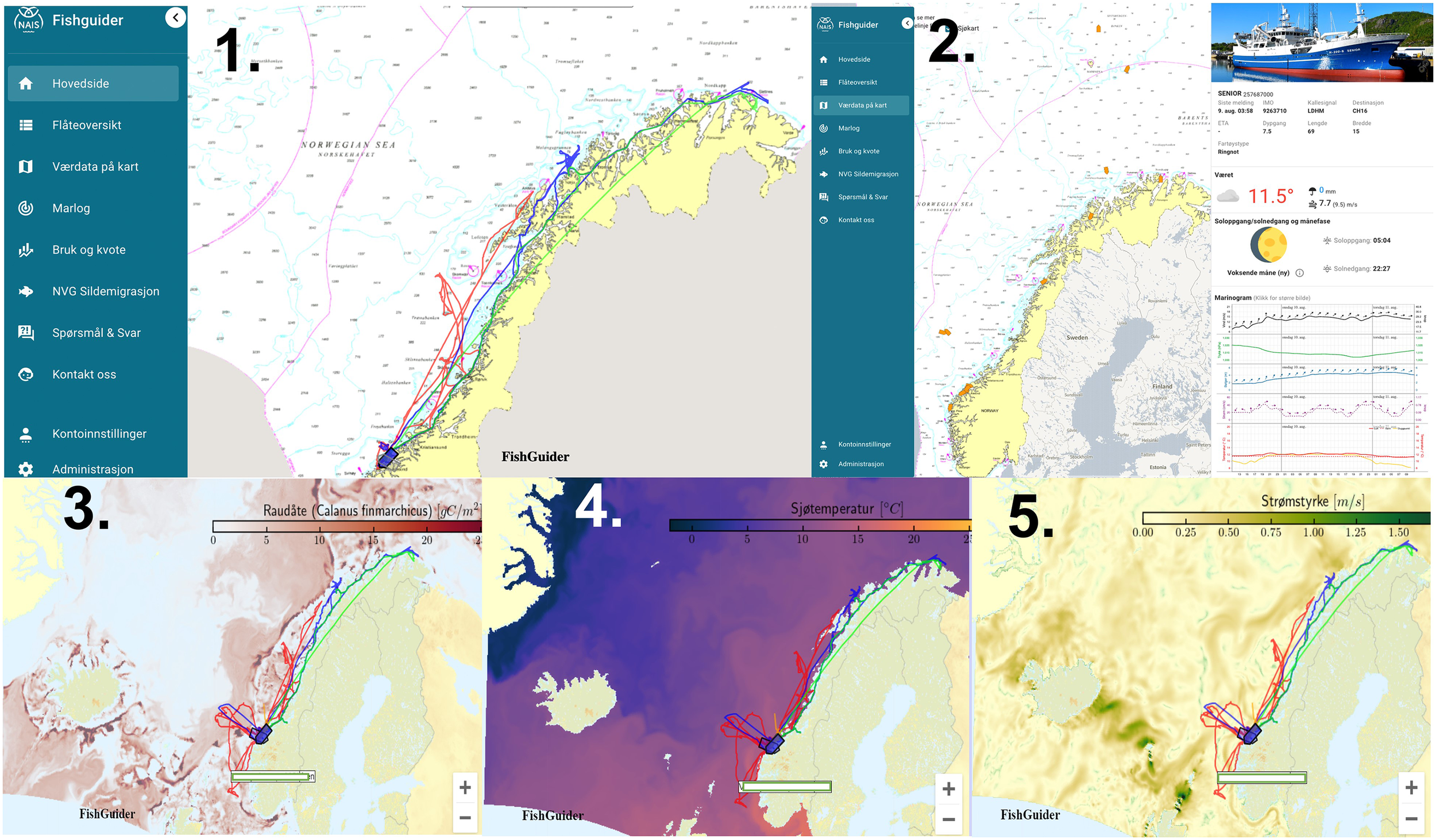 A selection of output layers in the Fishguider portal, with Norwegian text: 1) Homepage with tabs for various layers centered on the Norwegian Sea. The red, blue and green lines are the tracks of individual vessels based on GPS coordinates. 2) Weather data and forecast from the position of one of the NAIS vessels based on meterological institute data. 3) Modelled Calanus finmarchicus distribution and abundance in grams of carbon per meter squared 4) Sea surface temperature output on a single day in degrees Celsius. 5) Horizontal components of current velocities in meters per second.